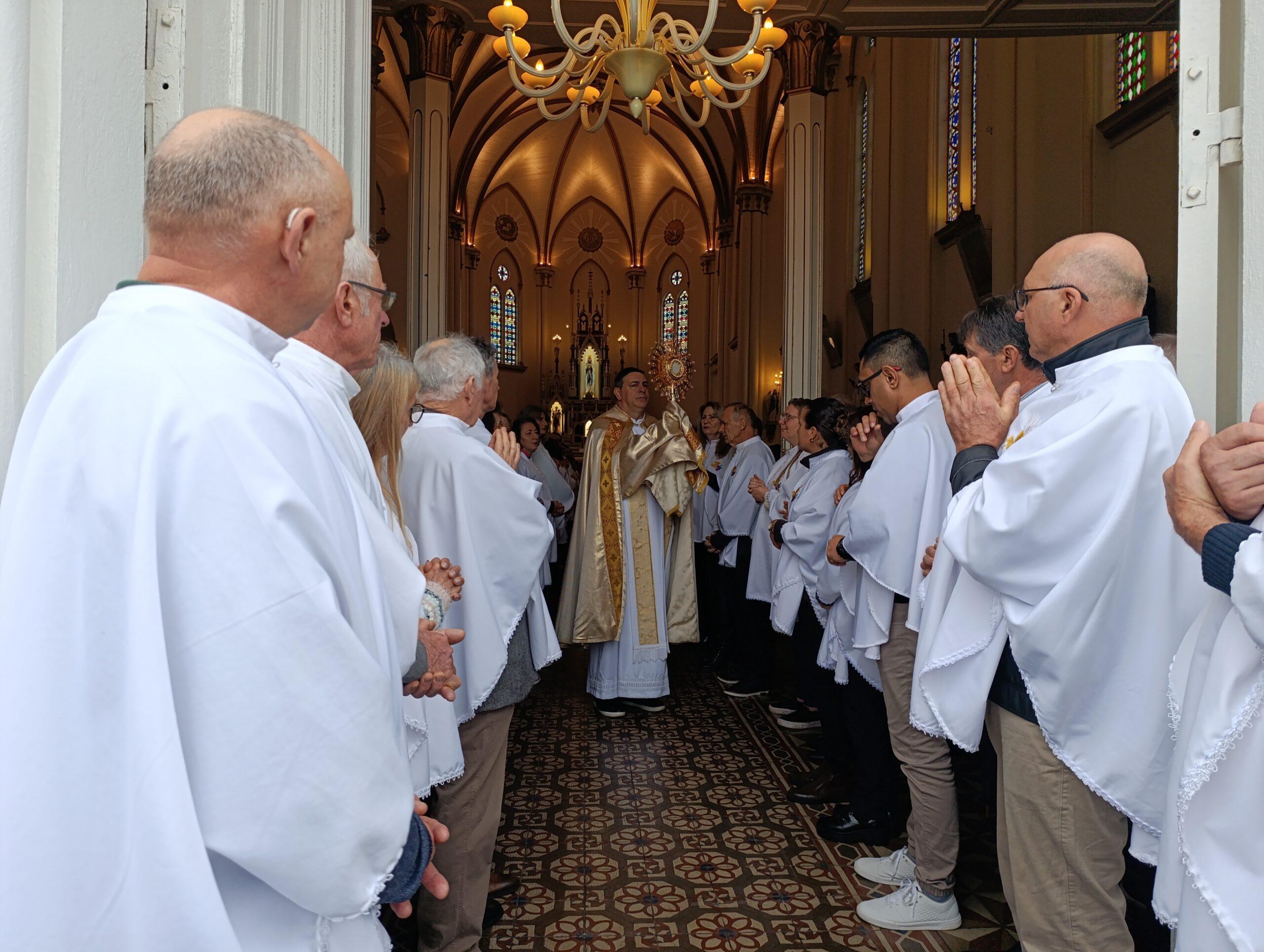 Na missa foi realizada a renovação do Ministério da Eucaristia, permitindo que os Ministros levem o Corpo e o Sangue de Cristo para suas comunidades por mais um ano. A procissão do Santíssimo sobre os tapetes, na área externa, deu lugar ao trajeto do corredor da Igreja Matriz.