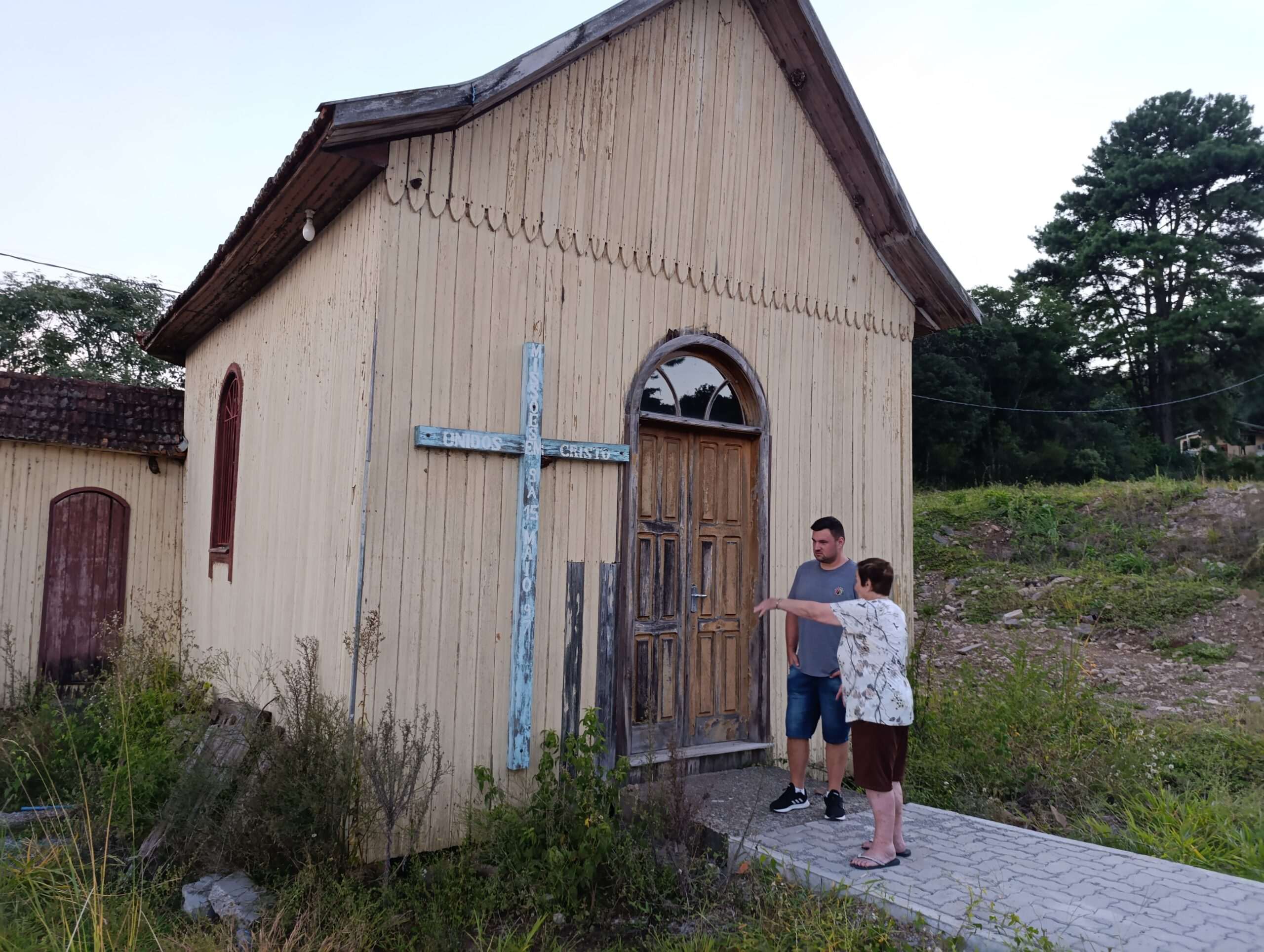 Terezinha e Renato Bordin observam a capela desativada há seis anos. (Foto: Karine Bergozza)