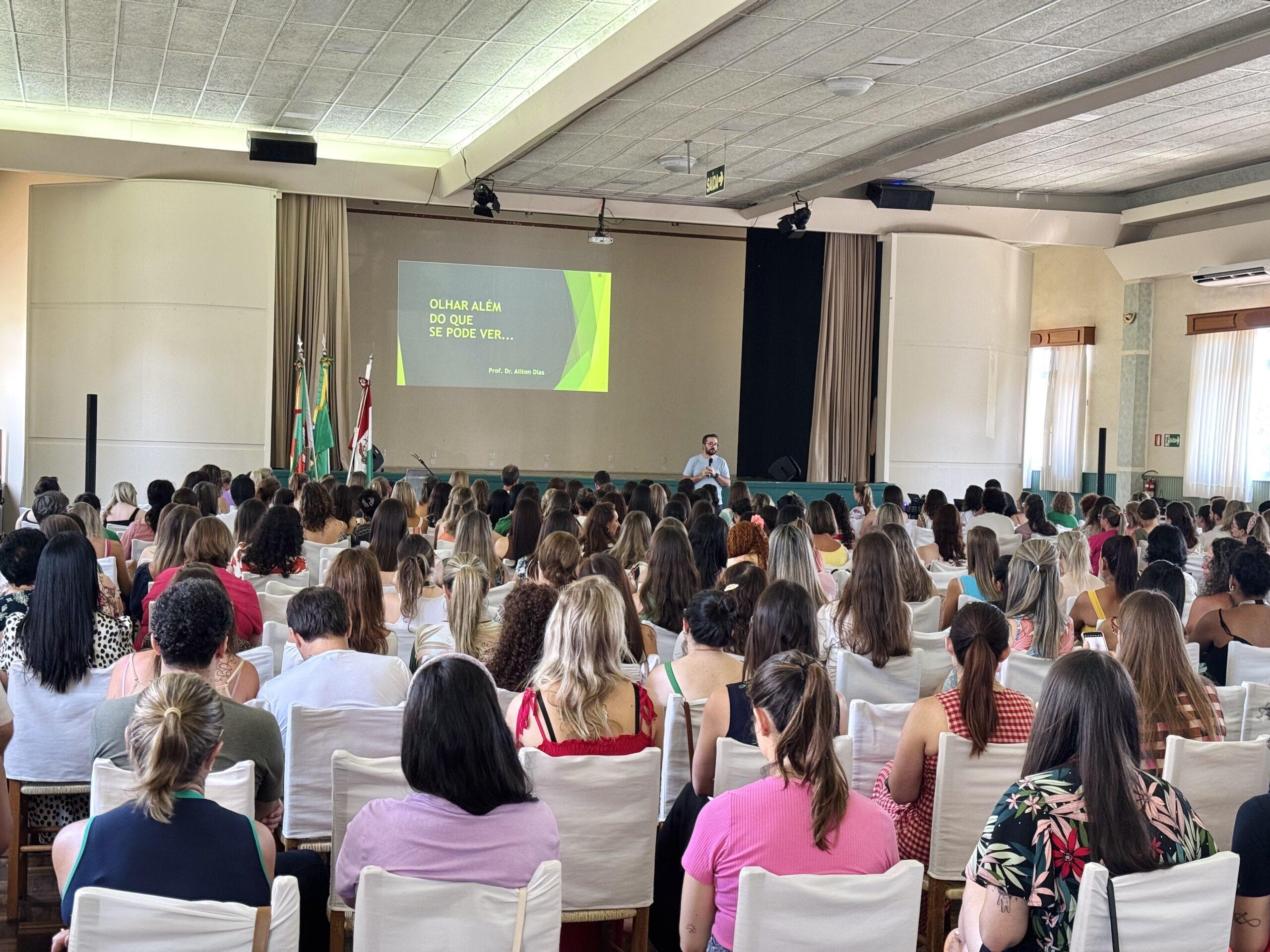 O ano letivo já iniciou para os professores da rede municipal de Flores da Cunha. Nesta segunda-feira (10), a secretaria de Educação, Cultura e Desporto realizou um encontro formativo no Salão Paroquial. O evento foi marcado por uma palestra do professor Dr. Ailton Dias, que discutiu o tema “Olhar para além do que se pode ver: abertura para novos pensamentos no campo pedagógico”. As aulas têm início na próxima quinta-feira (13).