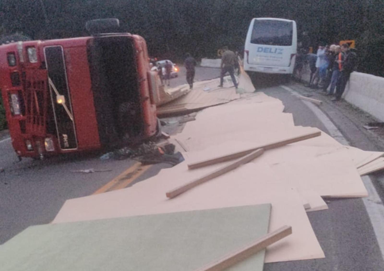 Acidente ocorreu na manhã desta sexta-feira (16) e envolveu uma carreta e um micro-ônibus. (Foto: Redes Sociais, Divulgação)