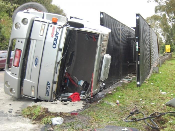 Um acidente no final da manhã desta quarta-feira, dia 8, no km 89 da ERS-122, em Flores da Cunha, deixou o motorista de um caminhão ferido. O caminhoneiro Paulo Roberto da Silveira, 34 anos, perdeu o controle do Ford Cargo placas AOT-2668, de Canoinhas (SC), numa curva próximo a São Gotardo e tombou sobre a pista. Silveira foi encaminhado ao Hospital Fátima da cidade, onde realiza exames. O caminhão trafegava sentido Caxias-Flores e transportava chassis da Randon para São Paulo, onde seriam montadas as carretas. No começo da semana passada, outro caminhão tombou sobre a rodovia a menos de 300 metros do acidente desta quarta, ferindo levemente o condutor de um Gol, que foi atingido antes da carreta tombar.