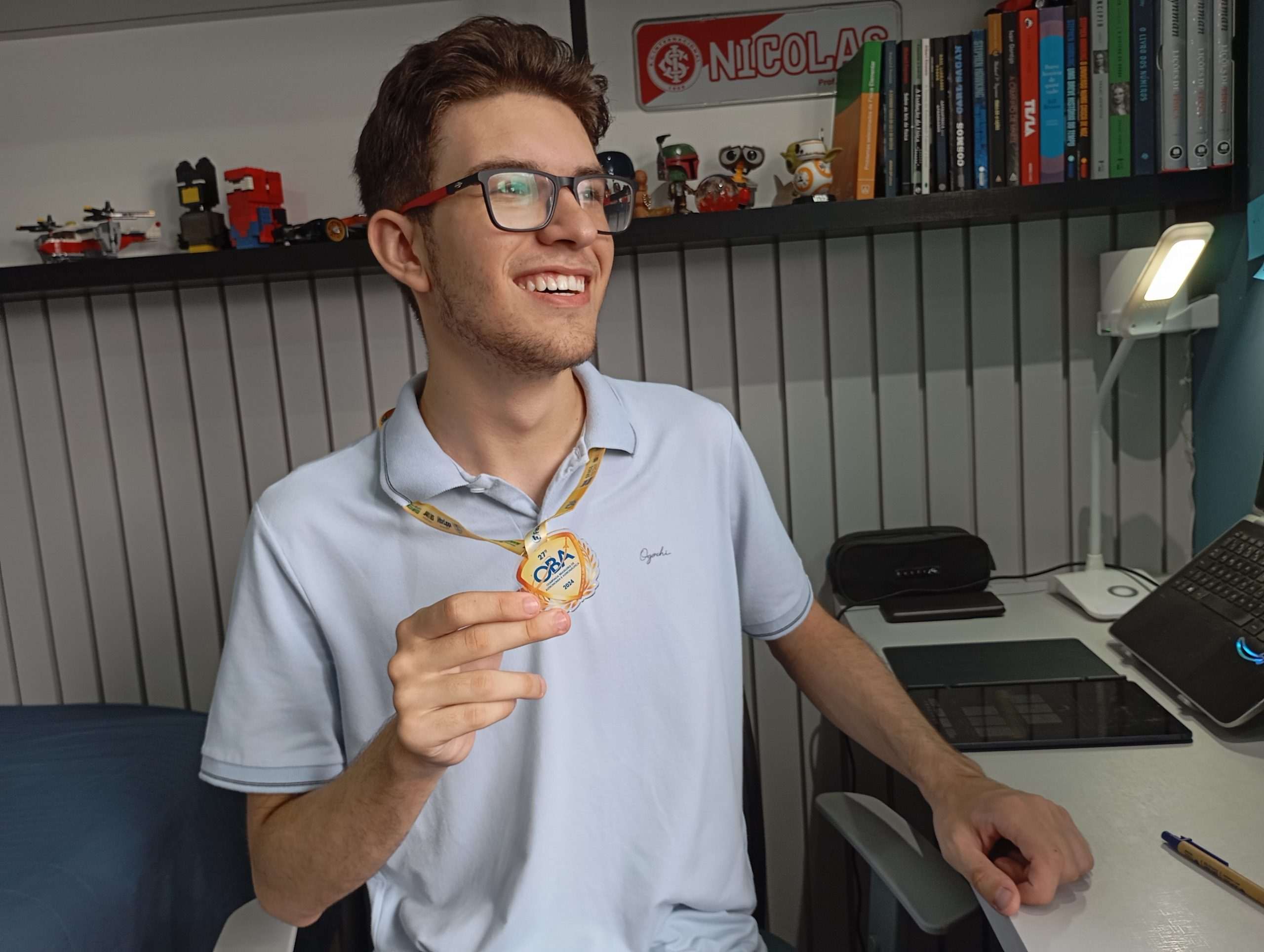 A etapa nacional será o terceiro momento das Olimpíadas. Primeiro, Nícolas respondeu a uma prova objetiva com 10 questões, onde conquistou uma nota de 9,6 e foi premiado com uma medalha de ouro (foto abaixo). A segunda fase, uma etapa online, os participantes enfrentaram três provas, cujo conteúdo foi mais desafiador.