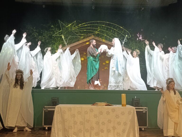 Mesmo com chuva, fieis se reuniram para assistir à tradicional encenação do nascimento de Jesus