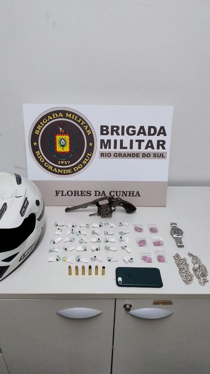 A Brigada Militar prendeu um homem de 22 anos por estar com uma arma de fogo de calibre restrito, pelo delito de tráfico de drogas e crimes conexos.