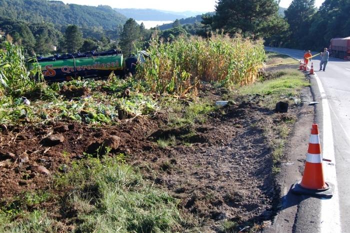 Um caminhão carregado com cerca de 18 mil litros de óleo diesel tombou por volta das 8h desta quinta-feira, dia 11 de abril, no Km 103 da ERS-122, distante dois quilômetros da praça de pedágio, em Flores da Cunha. O Mercedes-Benz modelo 2425, placas IQQ-2871, de Caxias do Sul, da empresa Querodiesel, seguia sentido Flores-Antônio Prado quando, por motivos ignorados, saiu da pista e tombou do lado esquerdo da rodovia, parando debaixo de um parreiral.