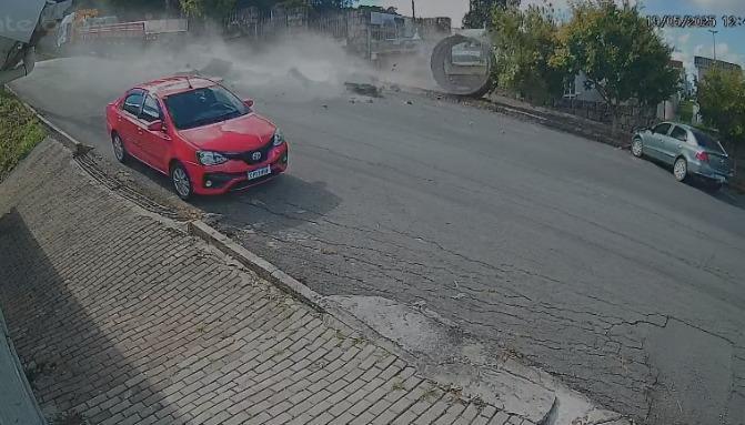 Imagens que circulam nas redes sociais, gravadas por câmera de vigilância por volta das 12h45min, mostram o momento em que os blocos descem a rua em alta velocidade e atingem uma árvore, que acaba sendo derrubada com o impacto. Durante o percurso, as estruturas se fragmentam, o que teria evitado danos maiores a dois carros estacionados próximos ao local do incidente.