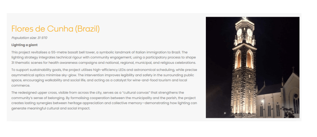 Um dos principais símbolos de Flores da Cunha acaba de ganhar reconhecimento internacional. O campanário da Igreja Matriz do município passou a integrar a vitrine virtual da Lighting Urban Community International (LUCI) Association, uma rede que reúne cidades e profissionais dedicados ao uso sustentável da iluminação urbana.
