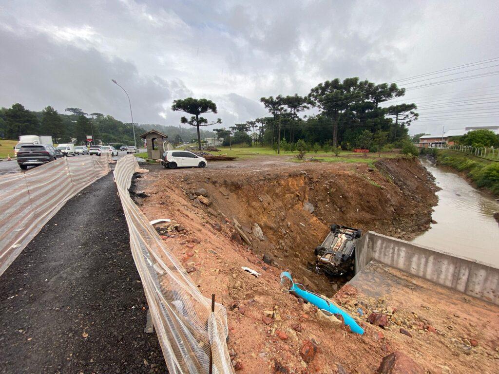 O acidente ocorreu no ponto aonde está ocorrendo a obra de ampliação da galeria pluvial do São Cristóvão. Três homens estavam no carro, o motorista acabou saindo do local e os outros dois foram levados ao Hospital Fátima pela ambulância do SAMU. A Brigada Militar também foi acionada.