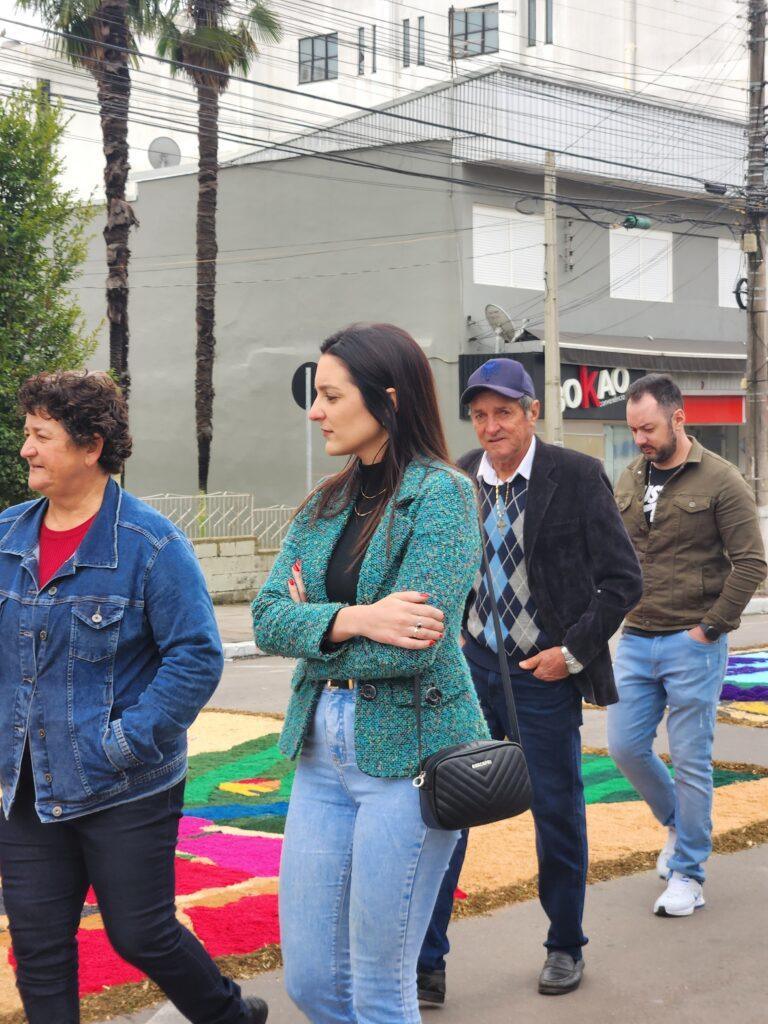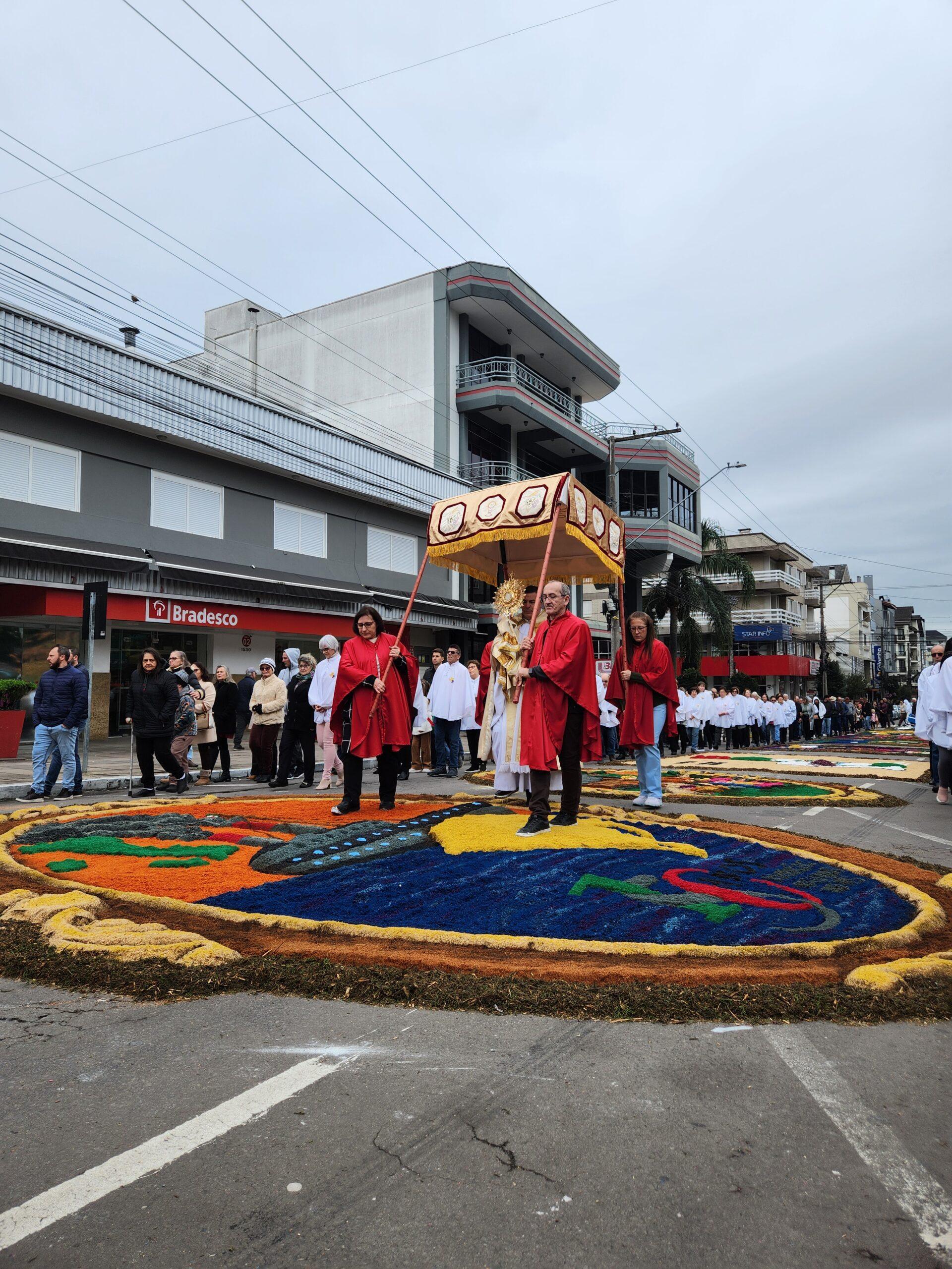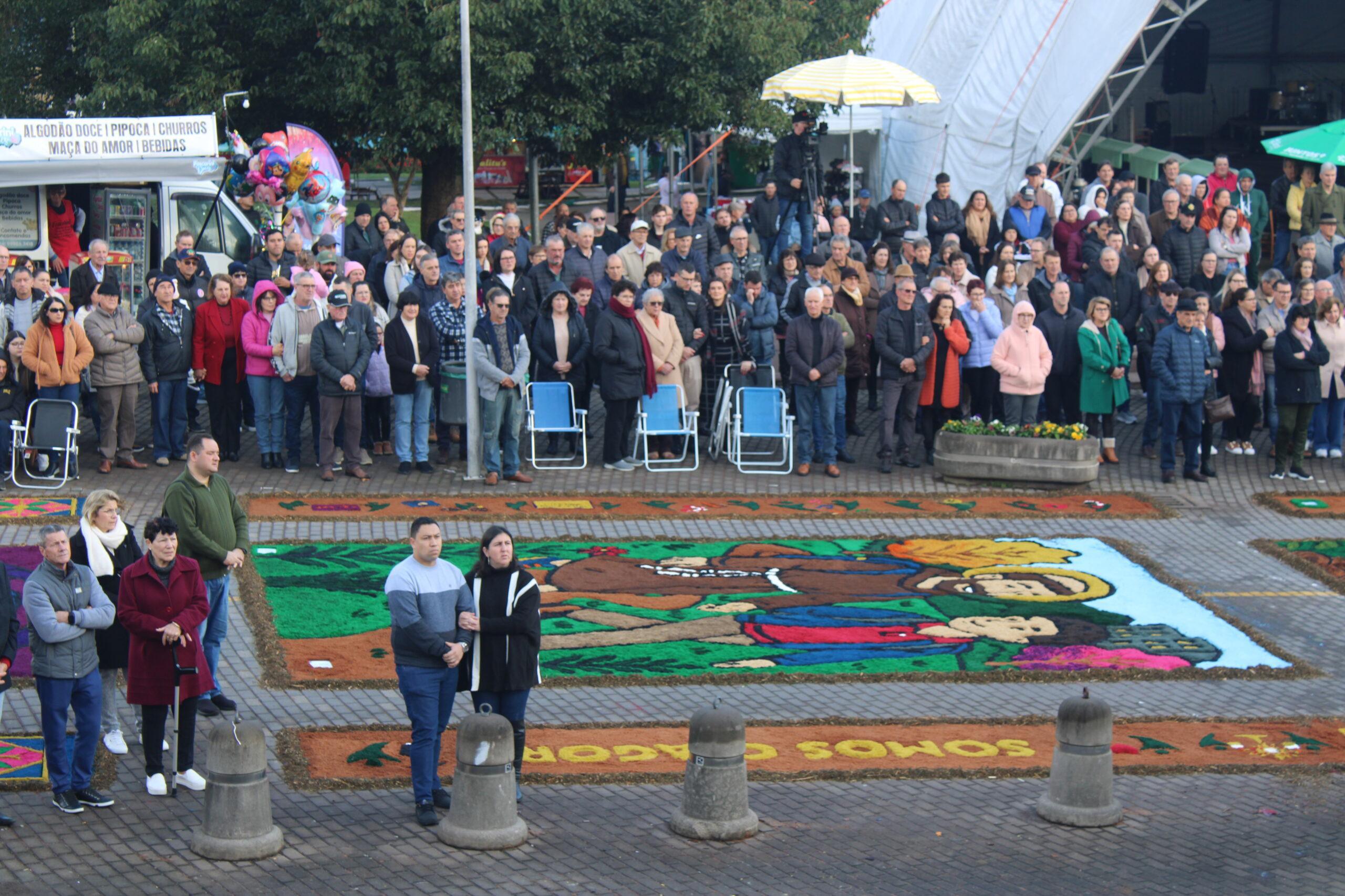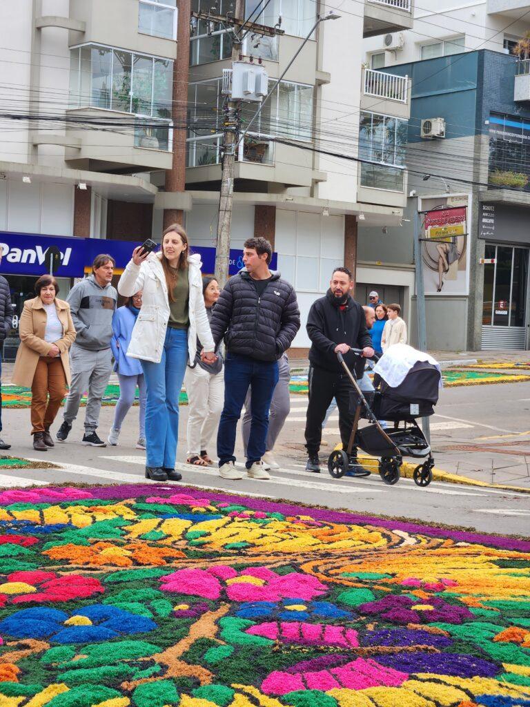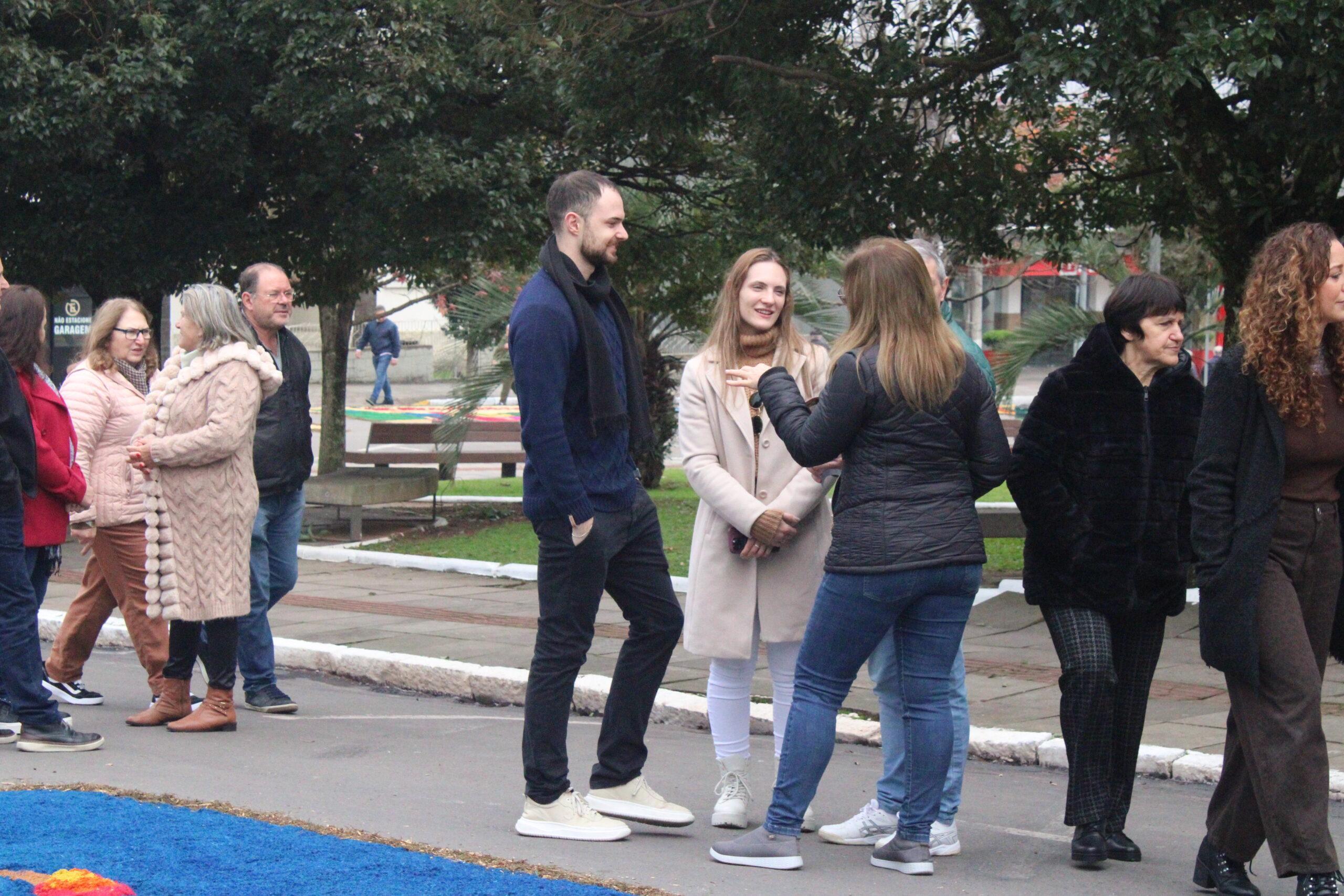 Para que a celebração seja possível, é necessária a mobilização de toda a comunidade na confecção dos tradicionais tapes de Corpus Christi. Geralmente organizado na quarta-feira que antecede a celebração, neste ano foi preciso repensar a dinâmica e todos os tapetes foram construídos durante o sábado (21), a partir das 7h. A bancária Fabiane Zucco, 32, que fez o tapete da Cresol junto de aproximadamente 10 pessoas, trouxe a família para conferir o resultado.