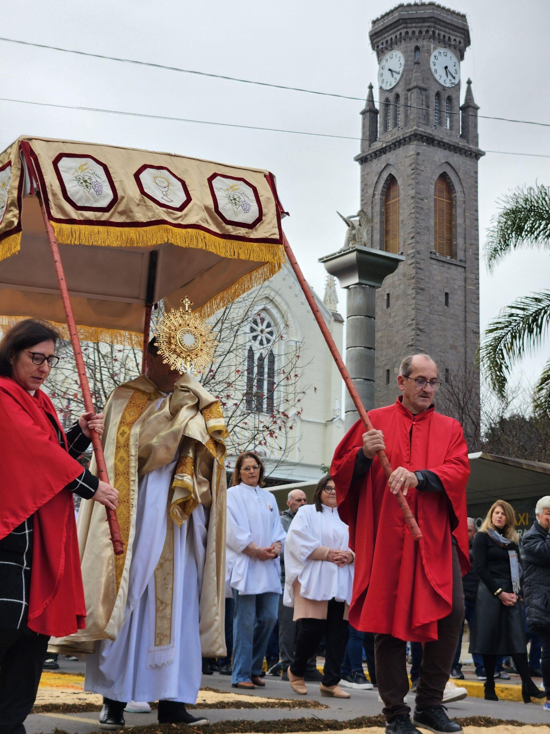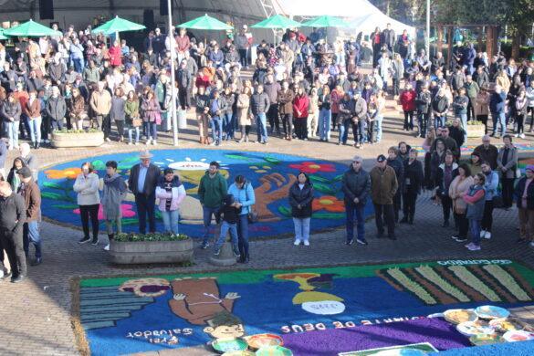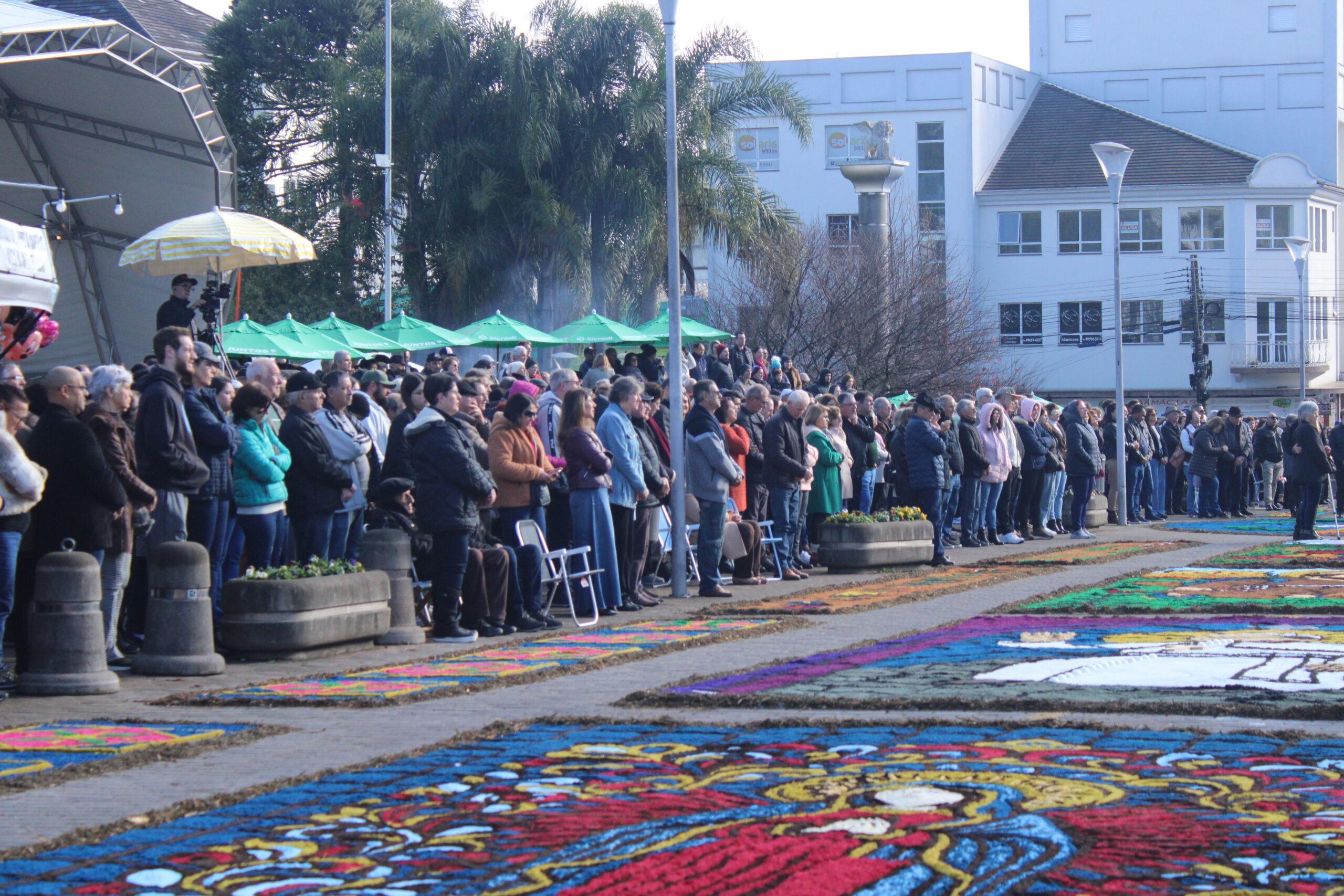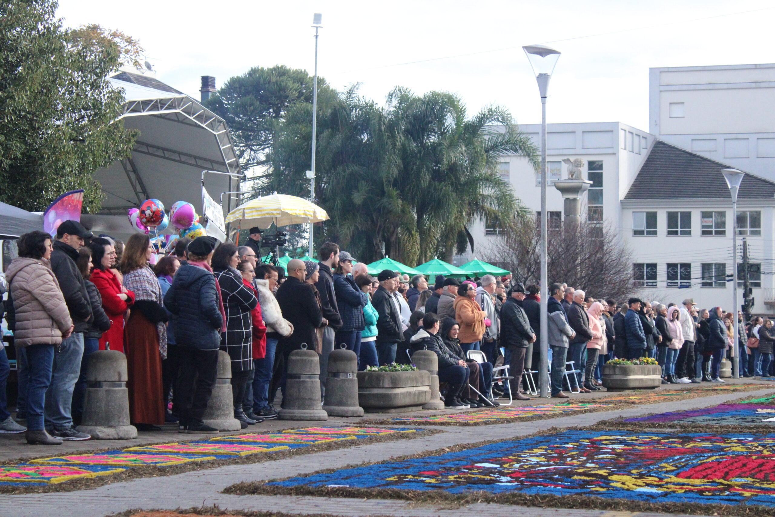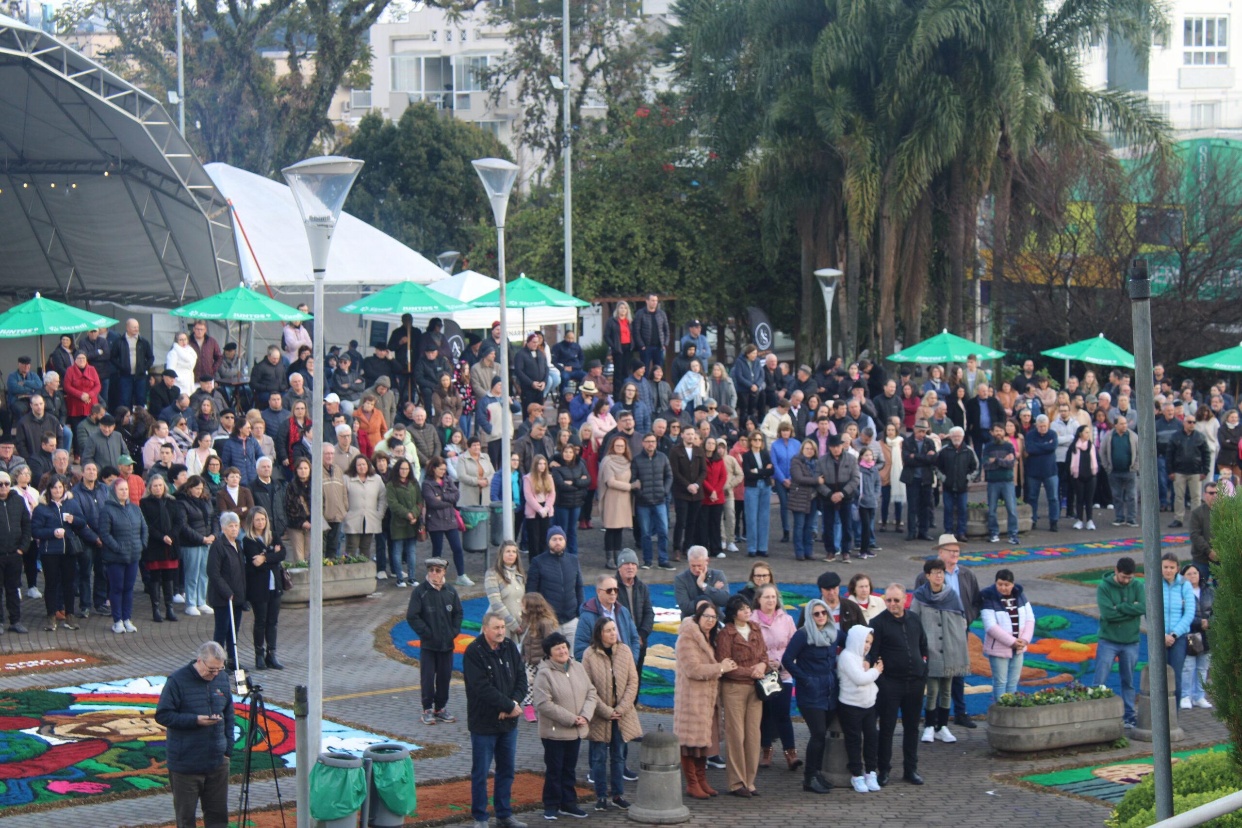 O frio e o céu entre nuvens não afastaram as centenas de pessoas que encheram de vida a praça da Bandeira, em Flores da Cunha, na manhã deste domingo (22). O motivo não poderia ser mais significativo: a celebração de Corpus Christi, que neste ano precisou ser adiada por conta das chuvas intensas ao longo da semana e os alertas da Defesa Civil.