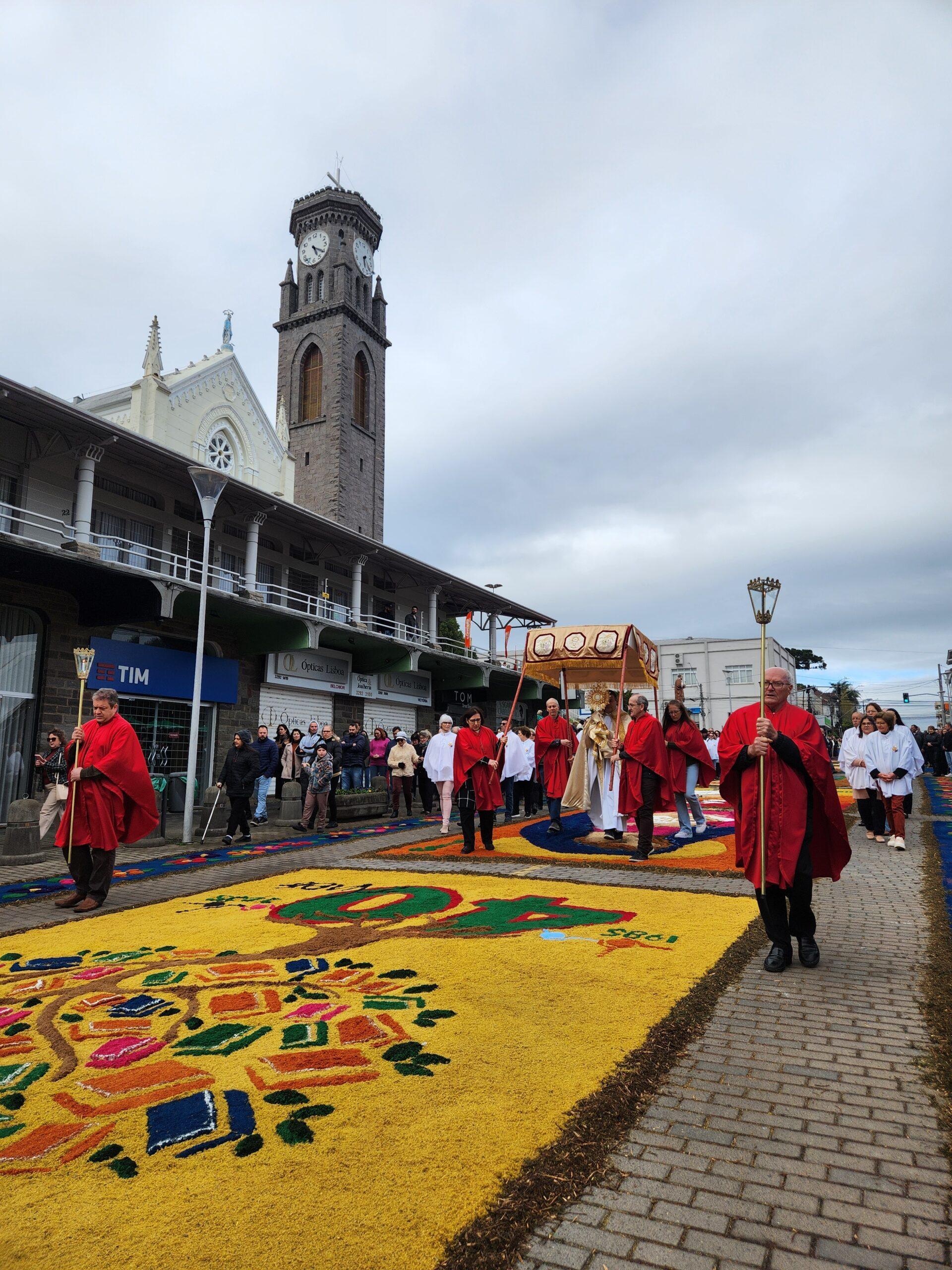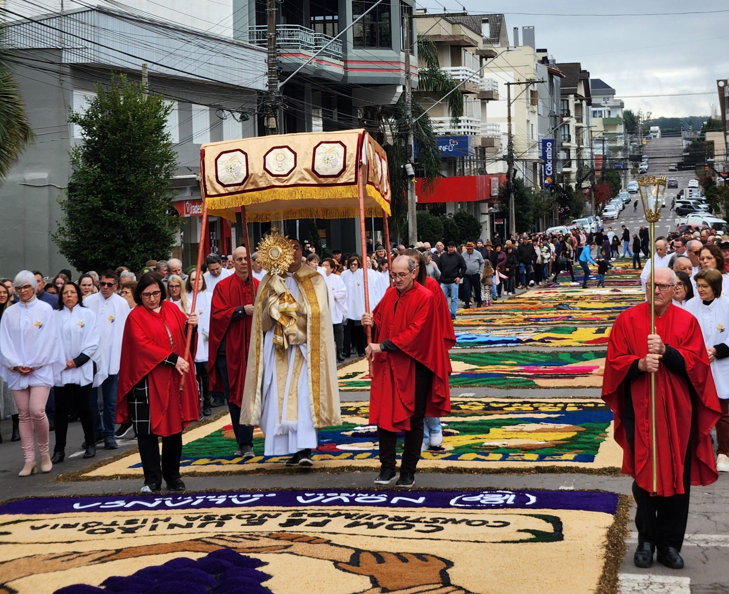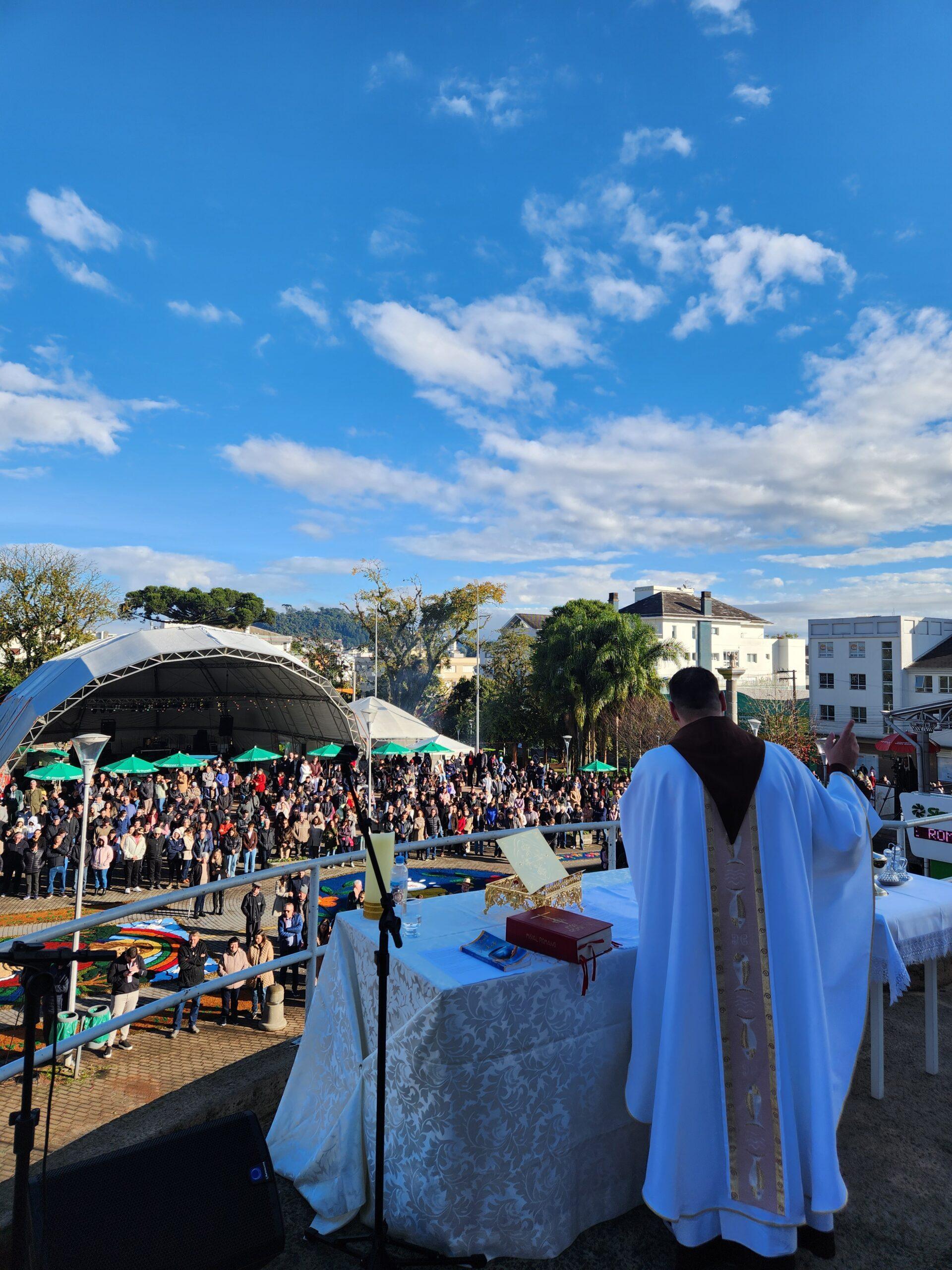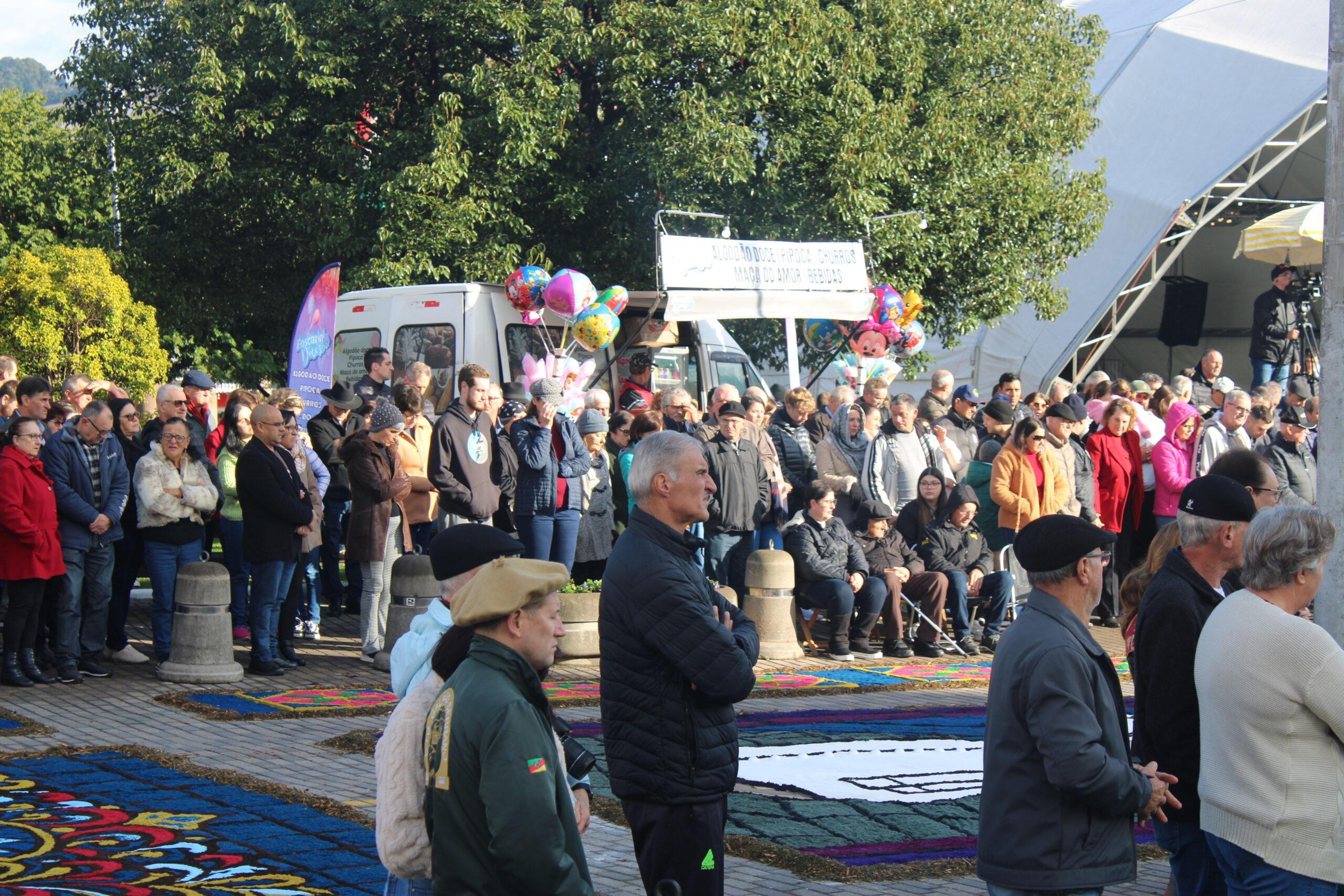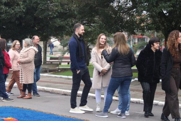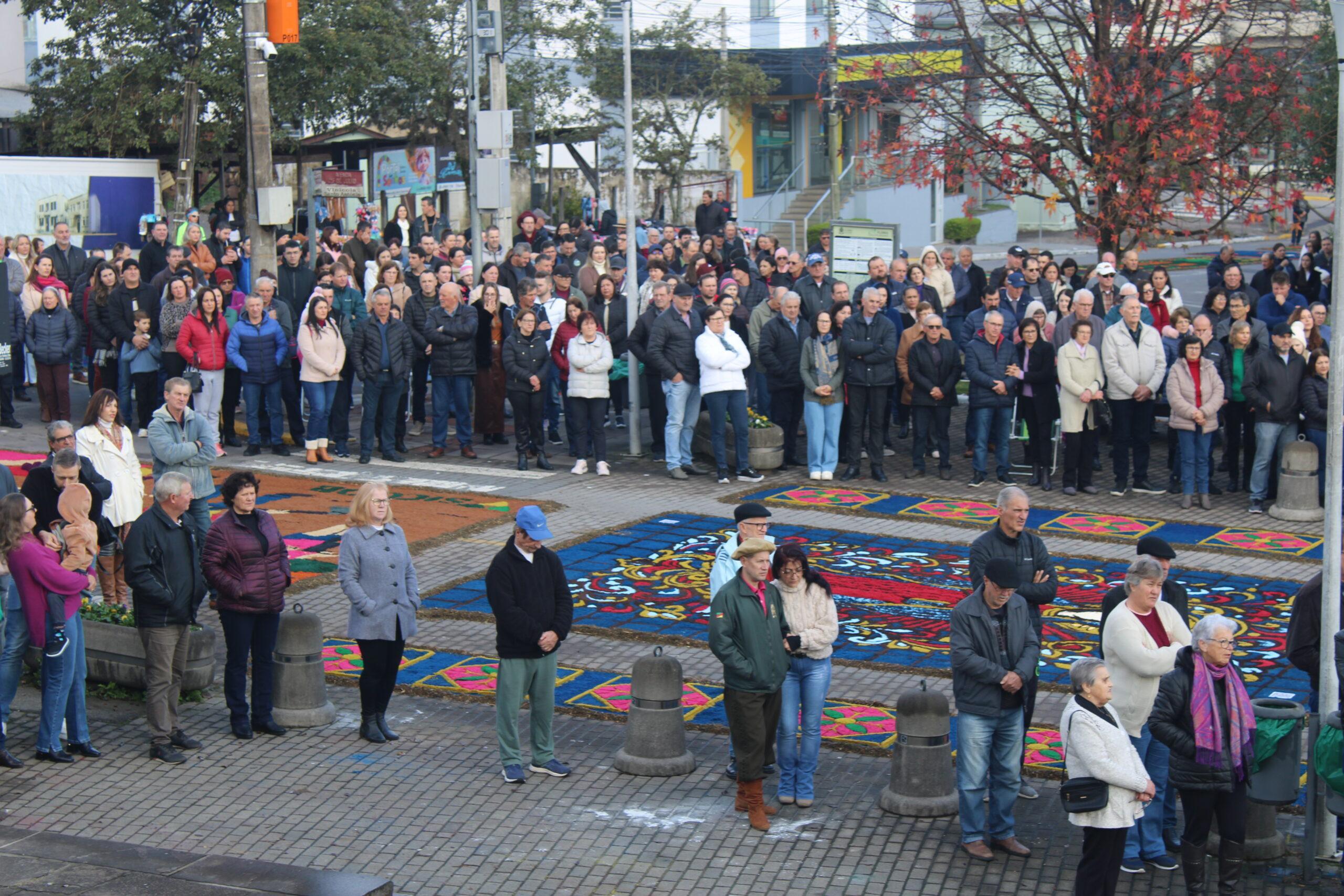 O frio e o céu entre nuvens não afastaram as centenas de pessoas que encheram de vida a praça da Bandeira, em Flores da Cunha, na manhã deste domingo (22). O motivo não poderia ser mais significativo: a celebração de Corpus Christi, que neste ano precisou ser adiada por conta das chuvas intensas ao longo da semana e os alertas da Defesa Civil.