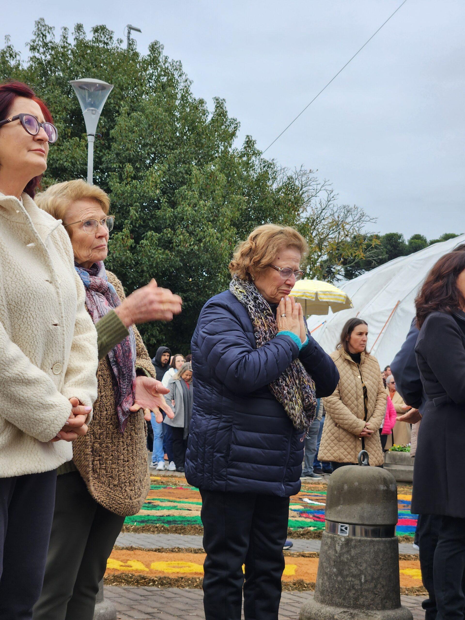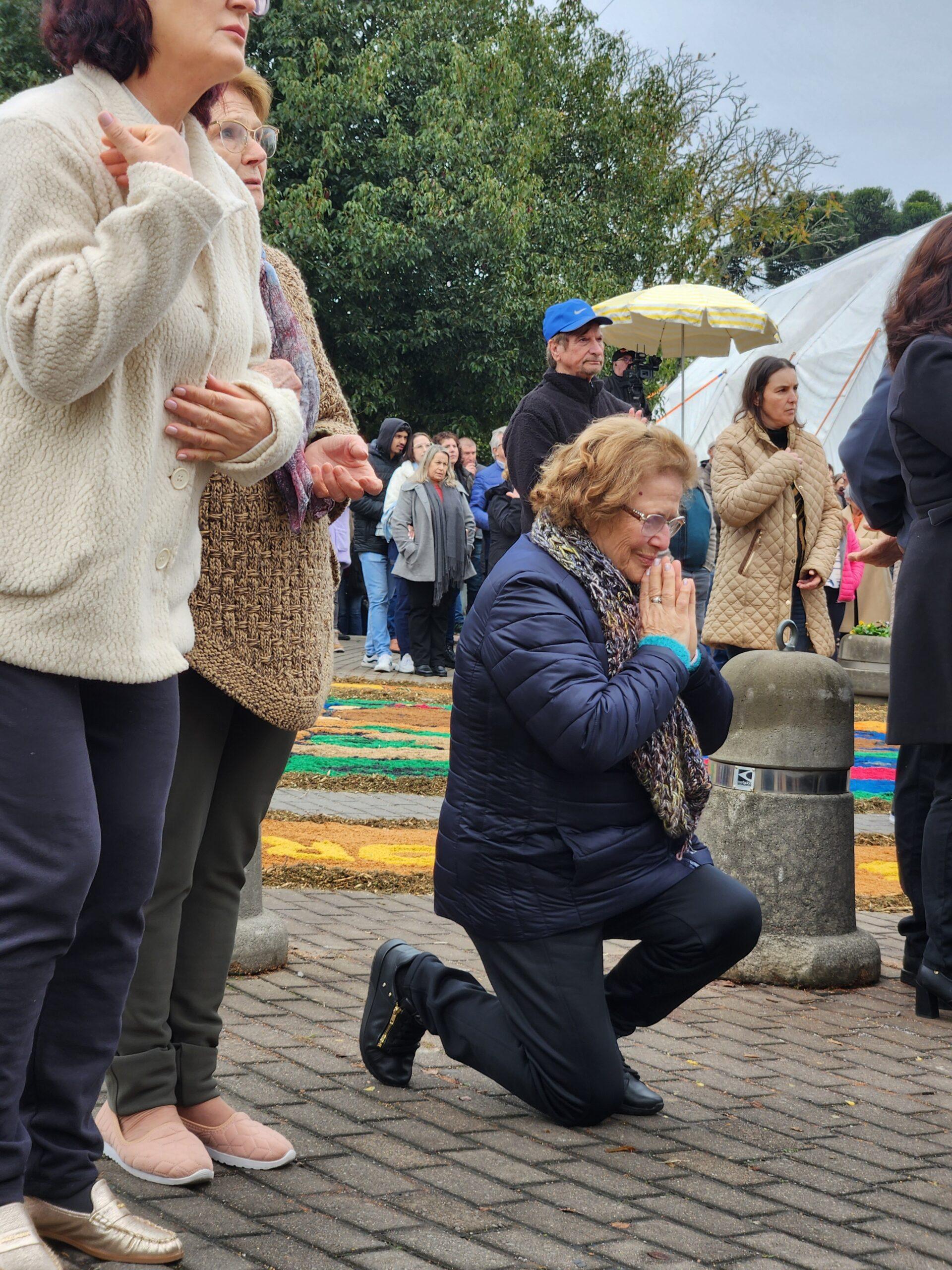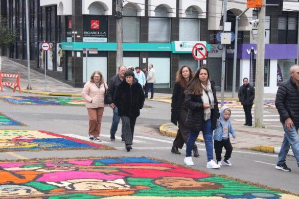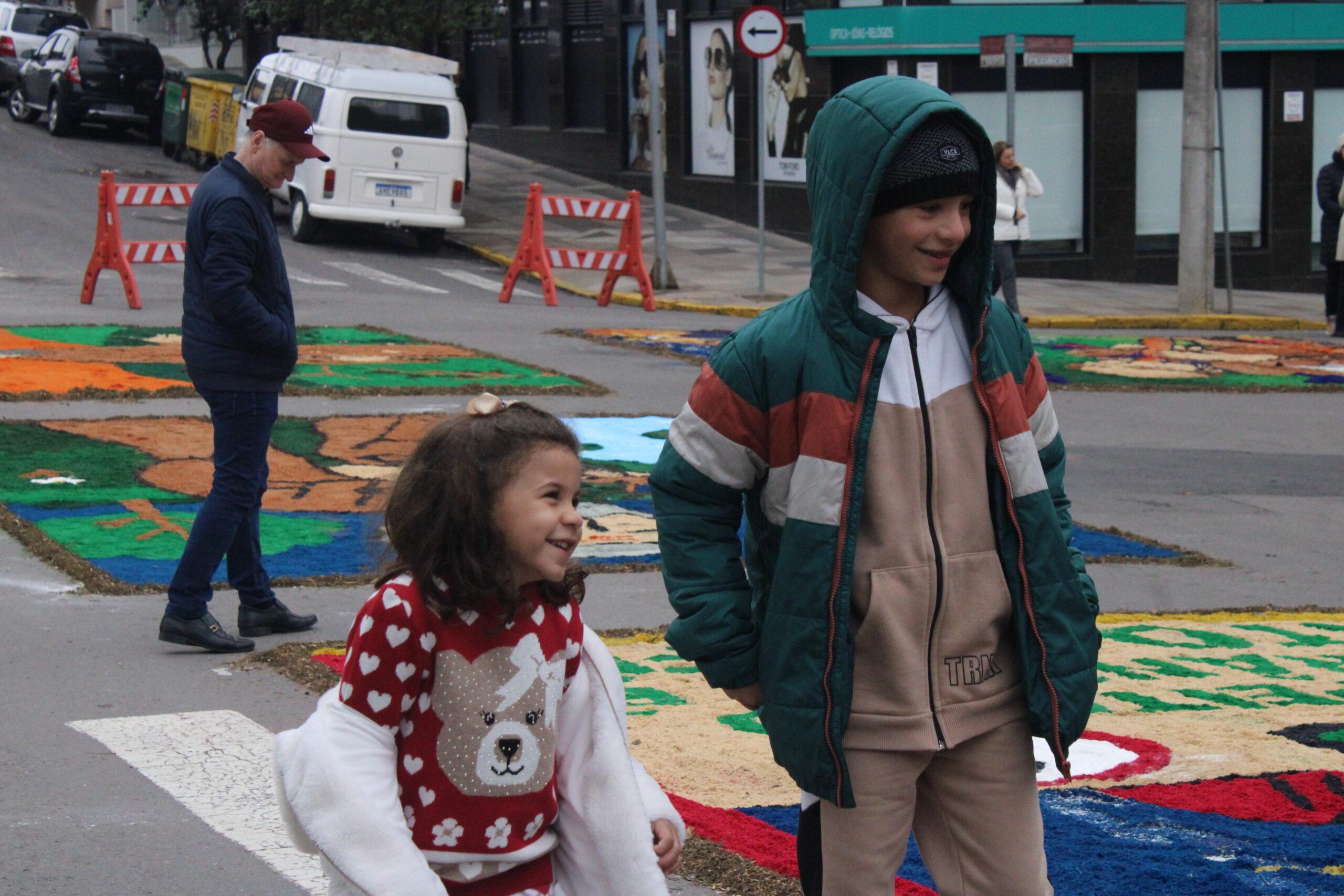 — Já faz quatro anos que confeccionamos os tapetes e é bem legal essa união das pessoas. Fica muito bonito. Achamos até que não íamos conseguir fazer por conta do tempo, que estava chovendo bastante, mas graças a Deus conseguimos fazer ontem em meio a garoa. Hoje saiu um dia bonito para o pessoal — afirma Fabiane mesmo sob o céu nublado.