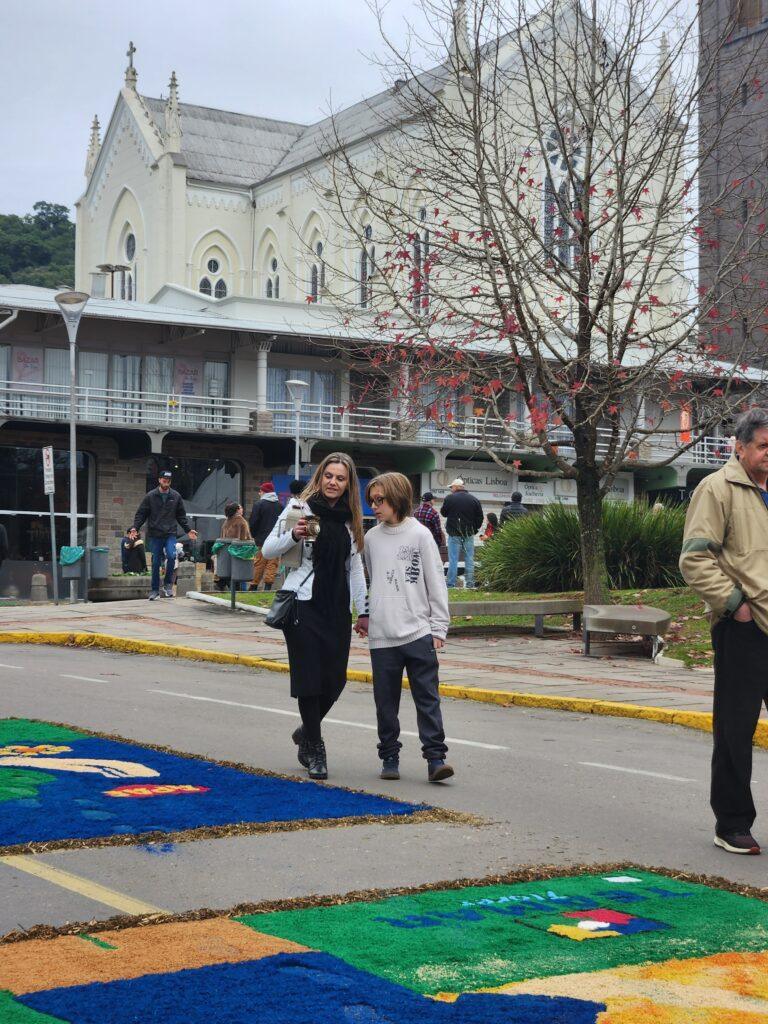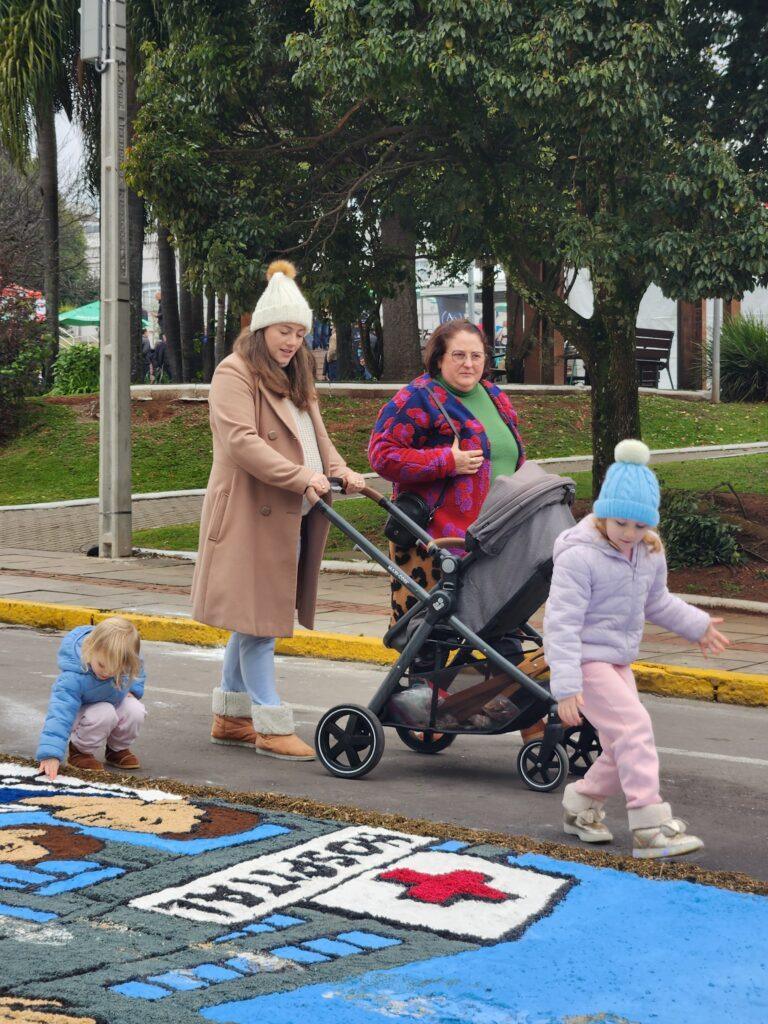 Família aproveitou a trégua na chuva para conferir o resultado da confecção nos tapetes feitos pela comunidade florense. (Foto: Paola Castro)
