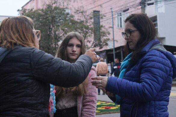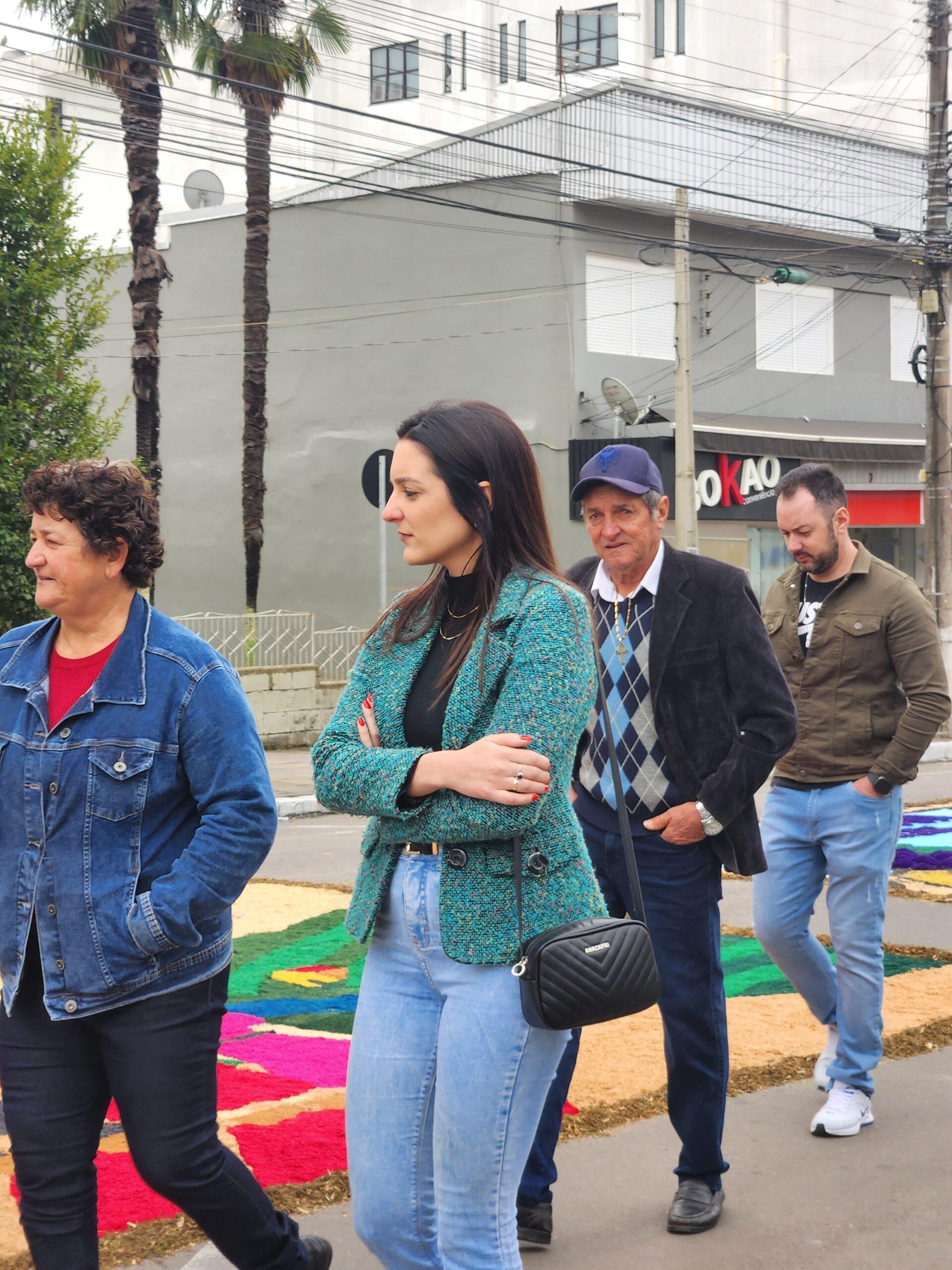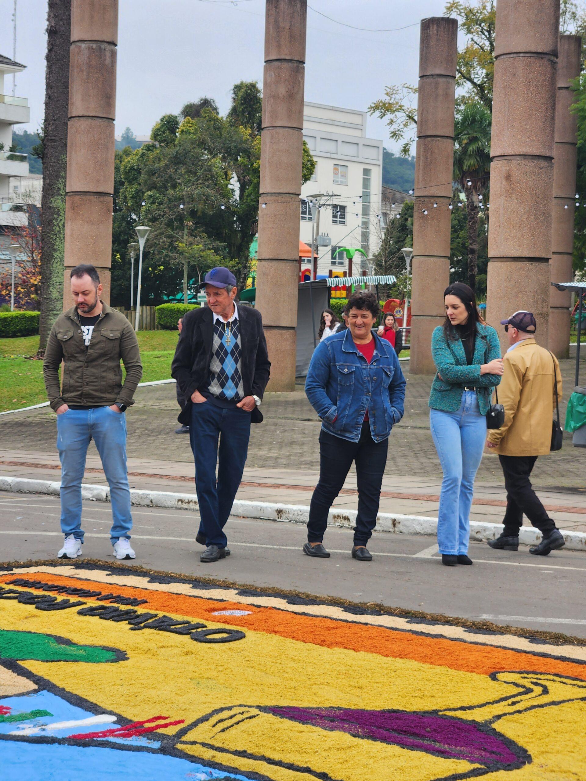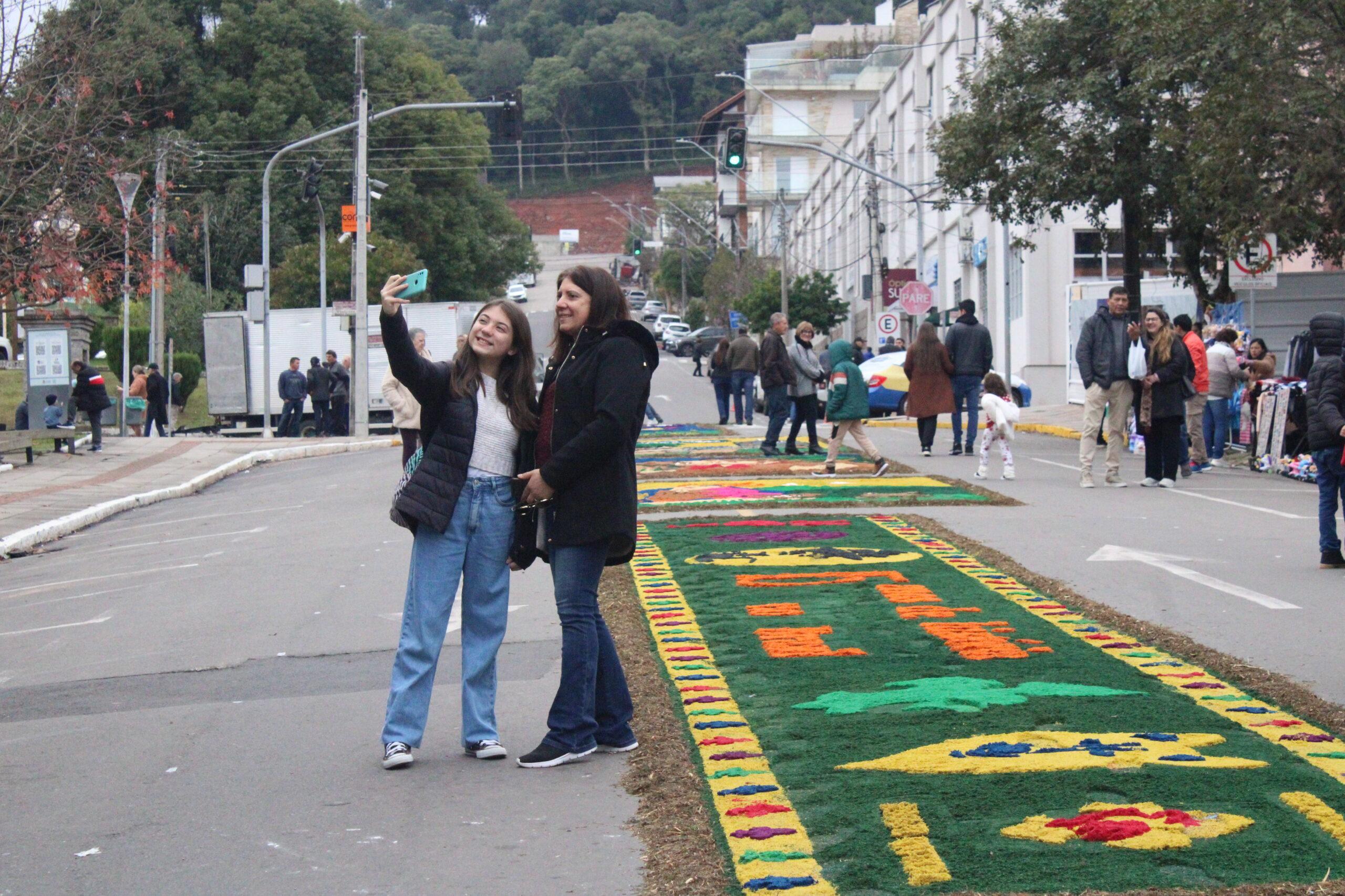 — Como não teve em Garibaldi por causa da chuva quisermos ver aqui em Flores (da Cunha). Eu adoro ver os tapetes, é bem bonito. Está incrível, muito lindo. A ideia é almoçar aqui e depois irmos na ExpoBento. Hoje o dia é só de passeio — conta a animada Angélica.