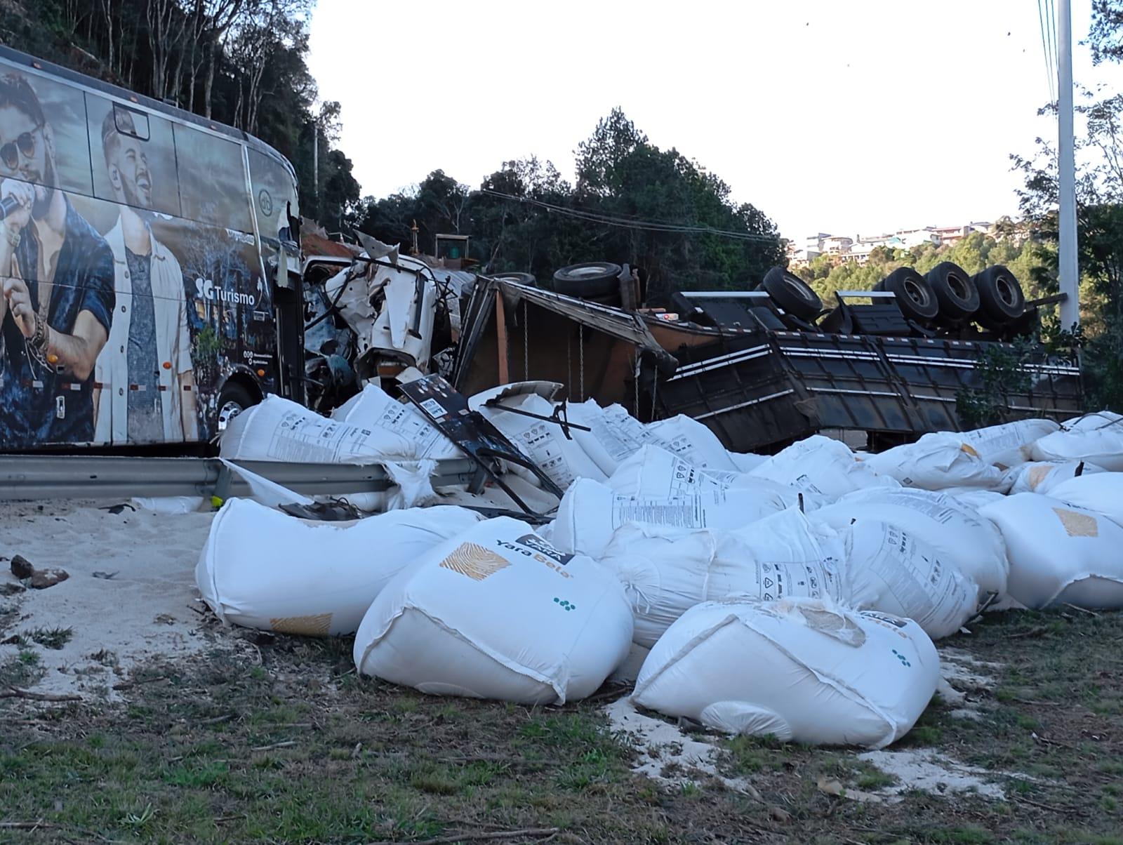 A carreta seguia no sentido Flores da Cunha, enquanto o ônibus ia em direção a Caxias do Sul, quando aconteceu a colisão. O acidente ocorreu justamente no trecho em que estão sendo realizadas obras de contenção do talude após os deslizamentos do ano passado, nas proximidades do trevo de acesso à Linha 40. Os veículos obstruem a pista e a carga de fertilizantes está espalhada após a carreta tombar.