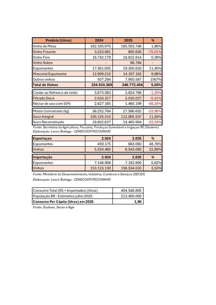 Em termos de importação, o maior crescimento foi de vinhos: 3,53% atingindo 158 milhões de litros. Por outro lado, as exportações tanto de vinhos como de espumantes também cresceram, atingindo juntos mais de 7,2 milhões de litros. Grande parte deste volume é produzido pela Fante, que consolidou exportações para o mercado latino-americano.Com base nos dados de comercialização das vinícolas do Rio Grande do Sul e das importações, o consumo per capita em 2025 manteve-se estável em 1,9 litros, ainda abaixo dos valores alcançados durante a pandemia de Covid-19, quando o consumo anual atingiu 2,3 litros por pessoa.