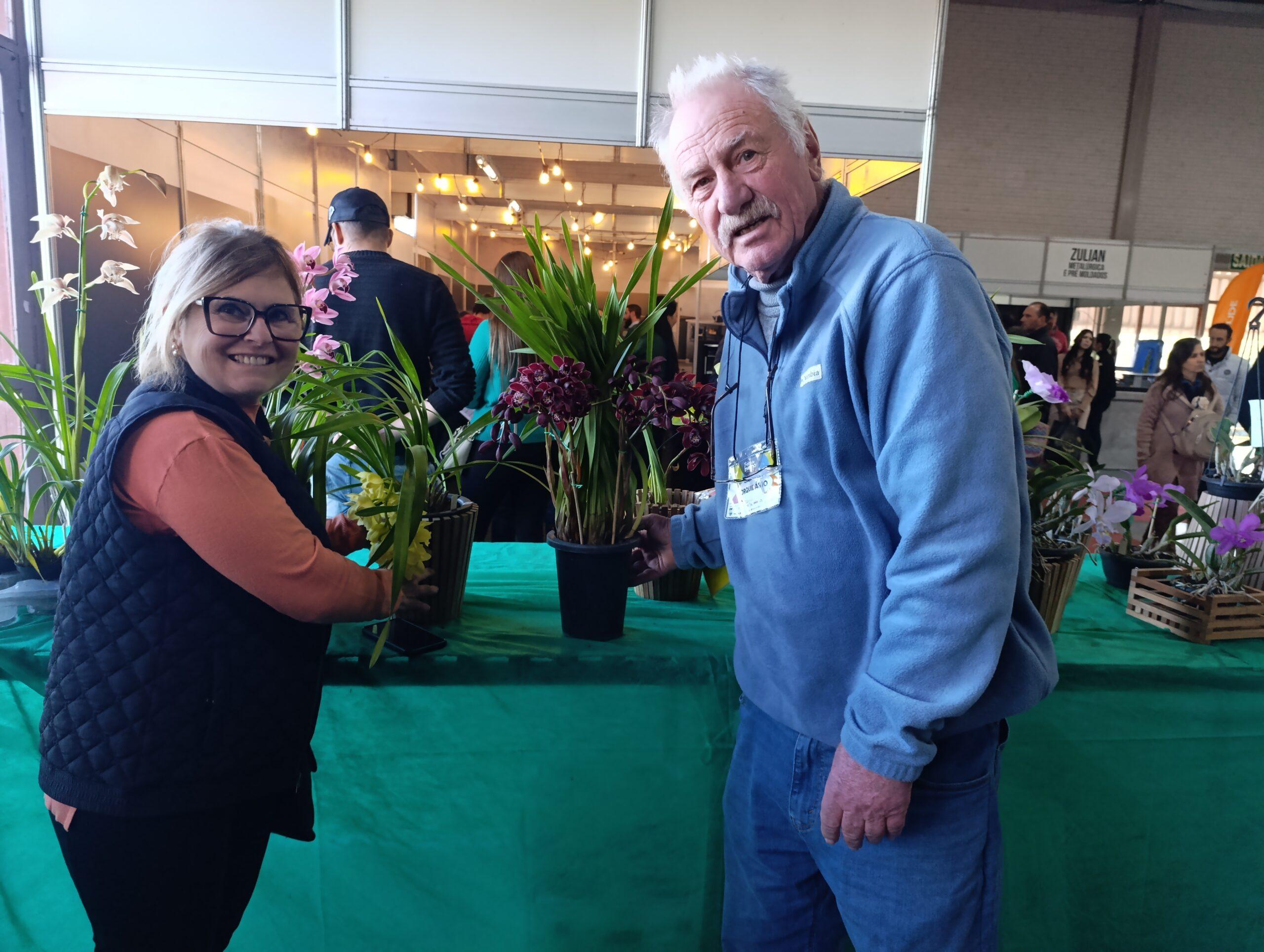 O orquidófilo Albertinho (Beto) Tomazzoni e a esposa, Mari Tomazzoni, ambos com 70 anos, são proprietários de um orquidário no bairro São Gotardo, em Flores da Cunha. Eles costumam participar da Feira de Inverno há muitos anos e avaliam o movimento do segundo final de semana como positivo.