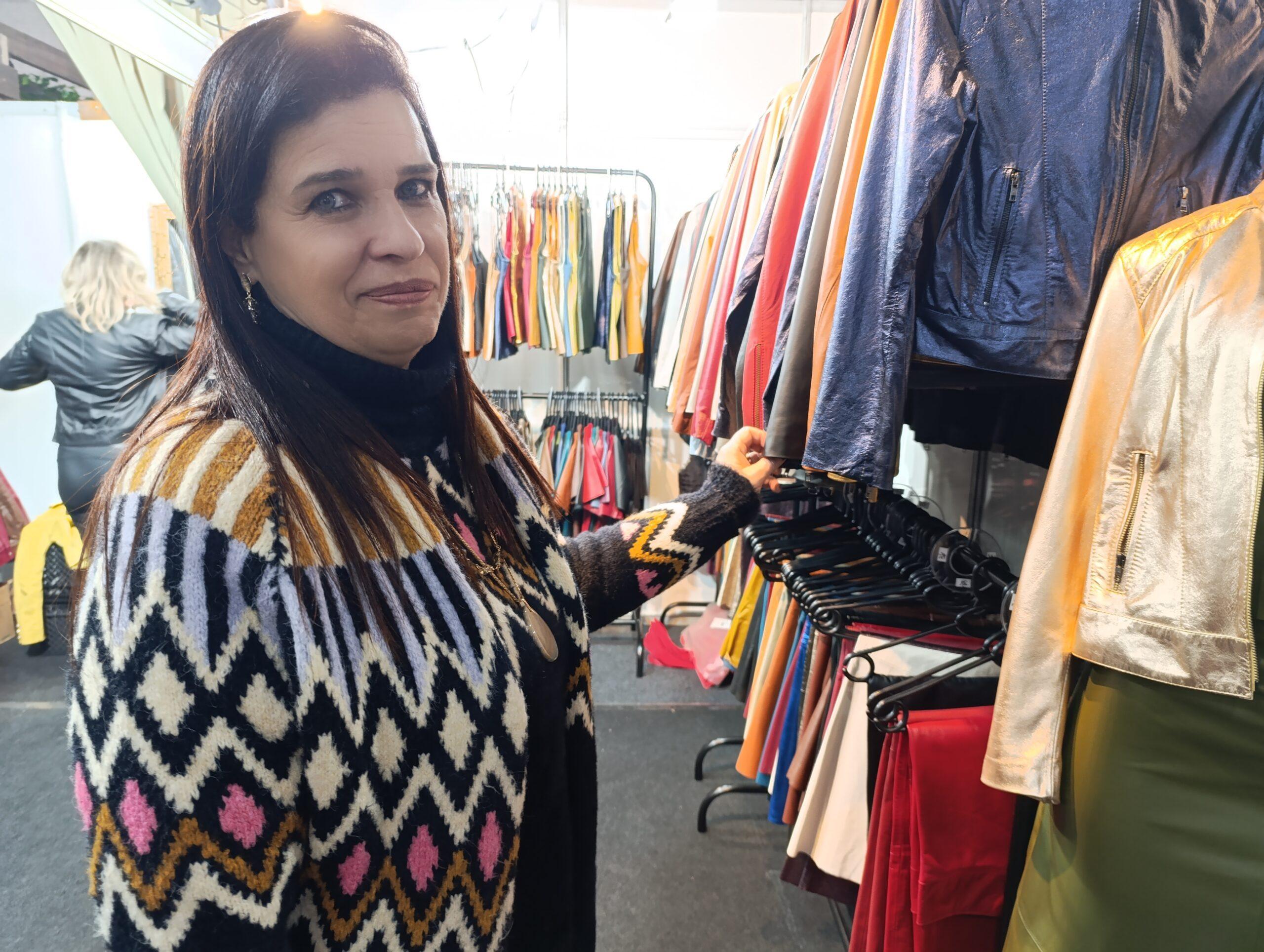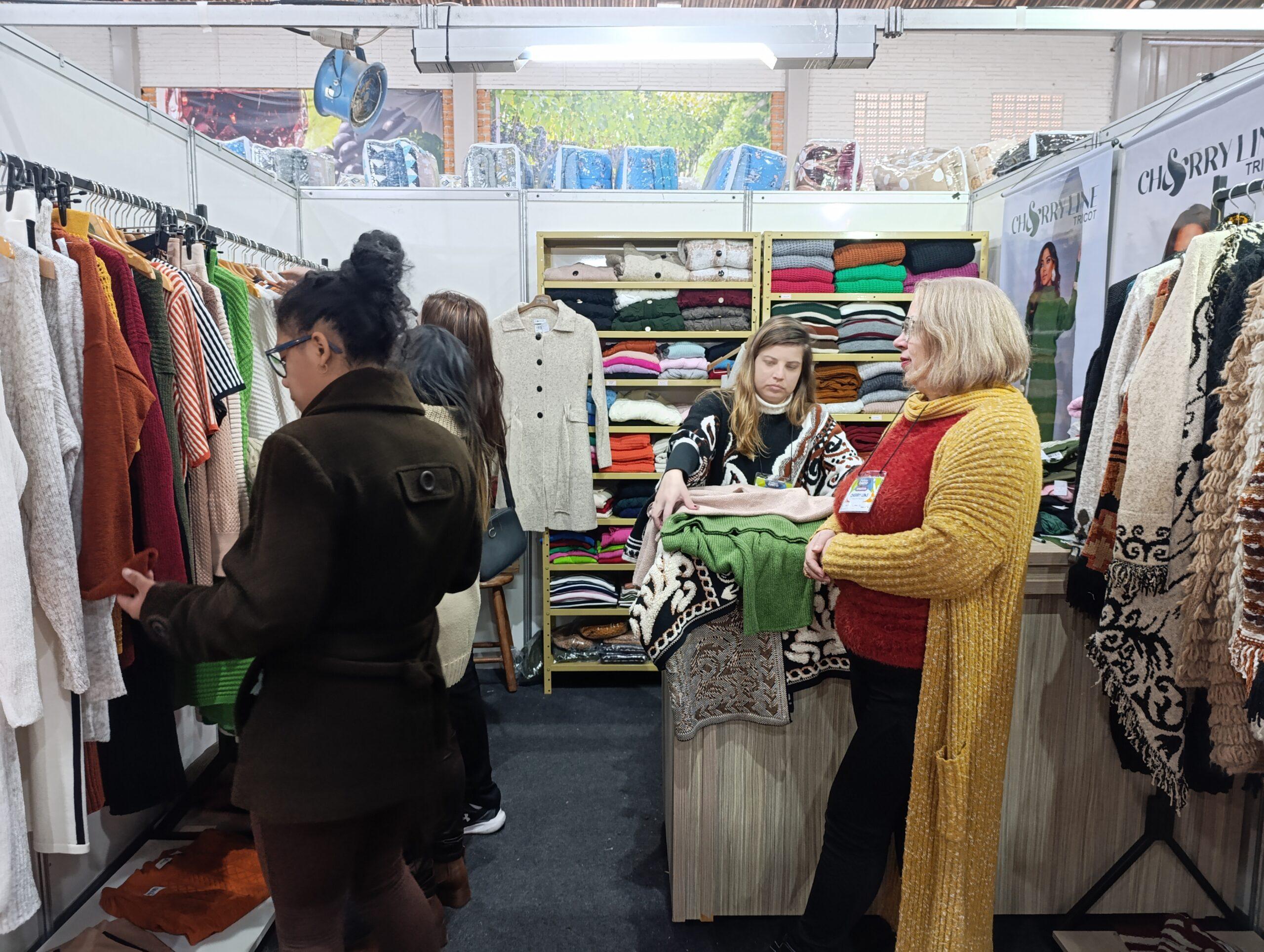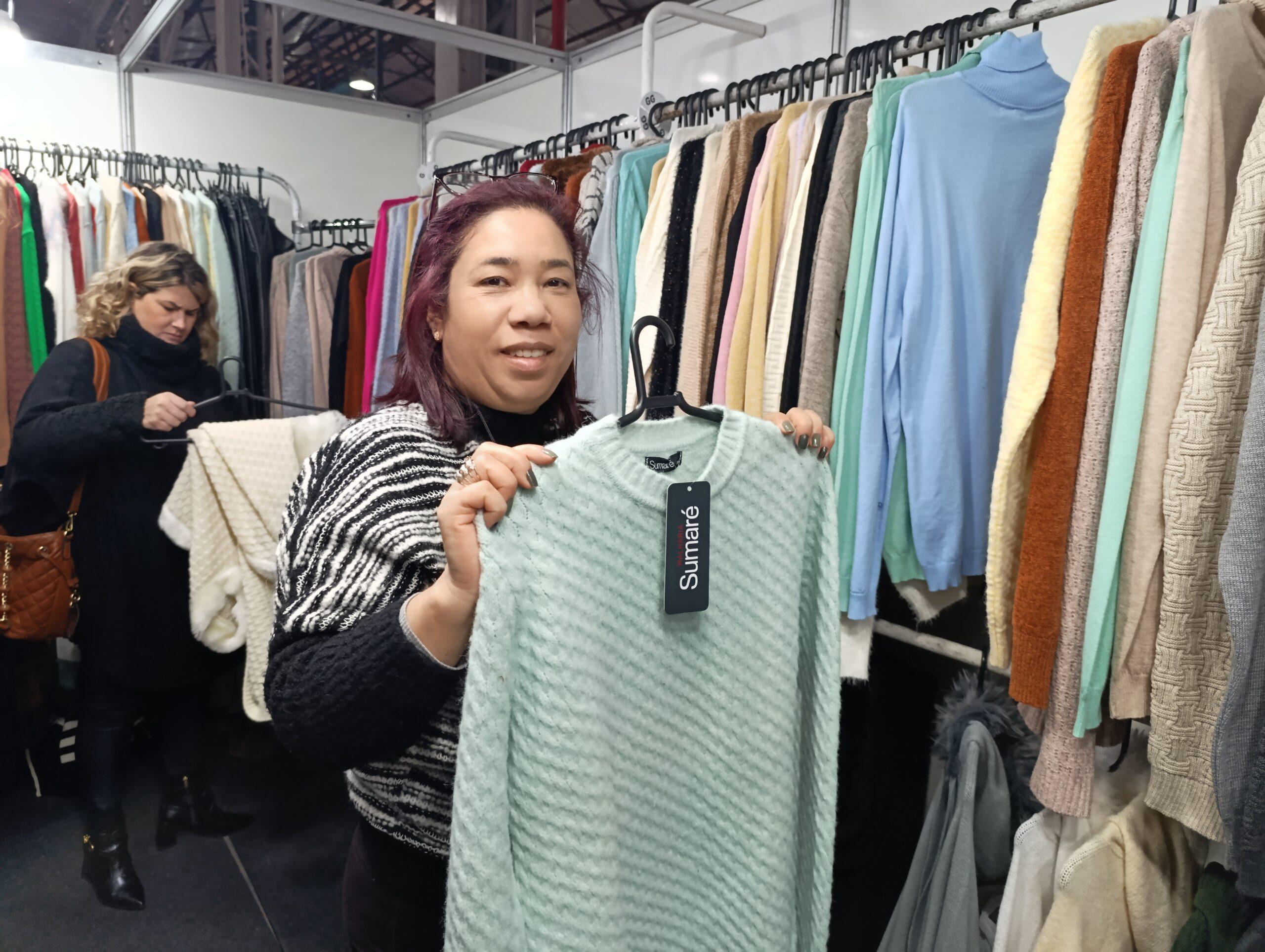 A vendedora da Sumaré Malhas, de Farroupilha, Regina Farias Fuhr, 54 anos, está expondo pela primeira vez na feira e aproveitando para conhecer o município florense.