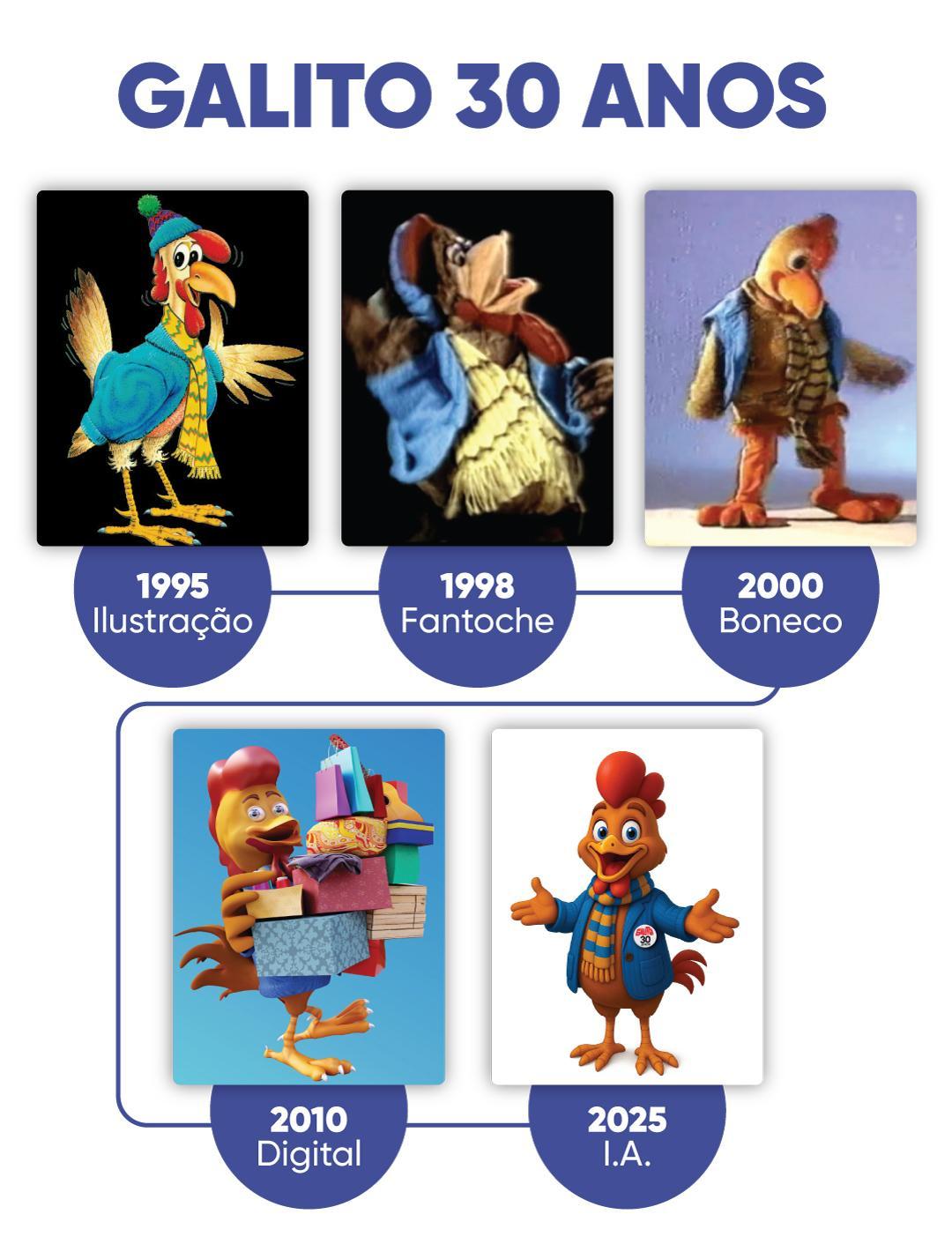 A evolução das tecnologias e seu uso na publicidade podem ser ilustradas por um dos personagens mais queridos de Flores da Cunha. O Galito, mascote da Feira de Inverno, sempre esteve na vanguarda das tendências, encontrando novas formas de interagir com o público e divulgar os atrativos do evento. Em 2025, o Galito completou 30 anos, com direito a bolo e suco de uva para as crianças que visitavam a Feira no último sábado (5).