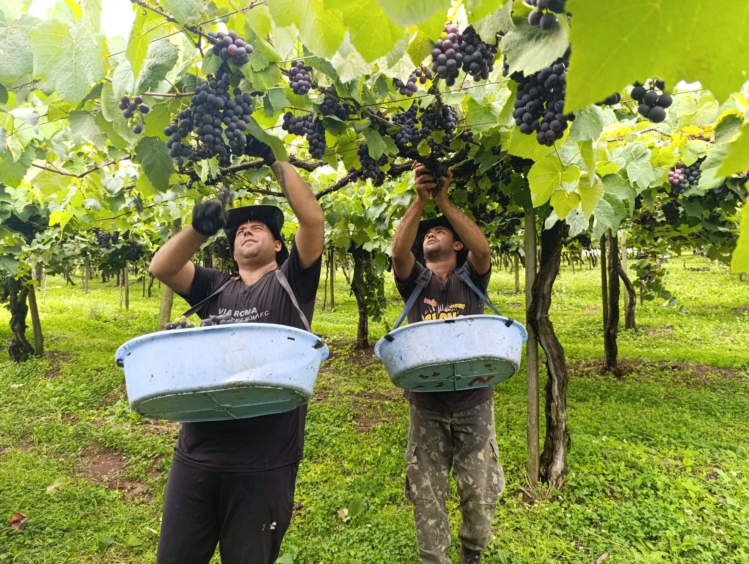 Ivan e dos Santos fazem parte da equipe contratada por Scortegagna para a colheita de sete hectares de uva da variedade Bordô e outros seis hectares de Isabel.