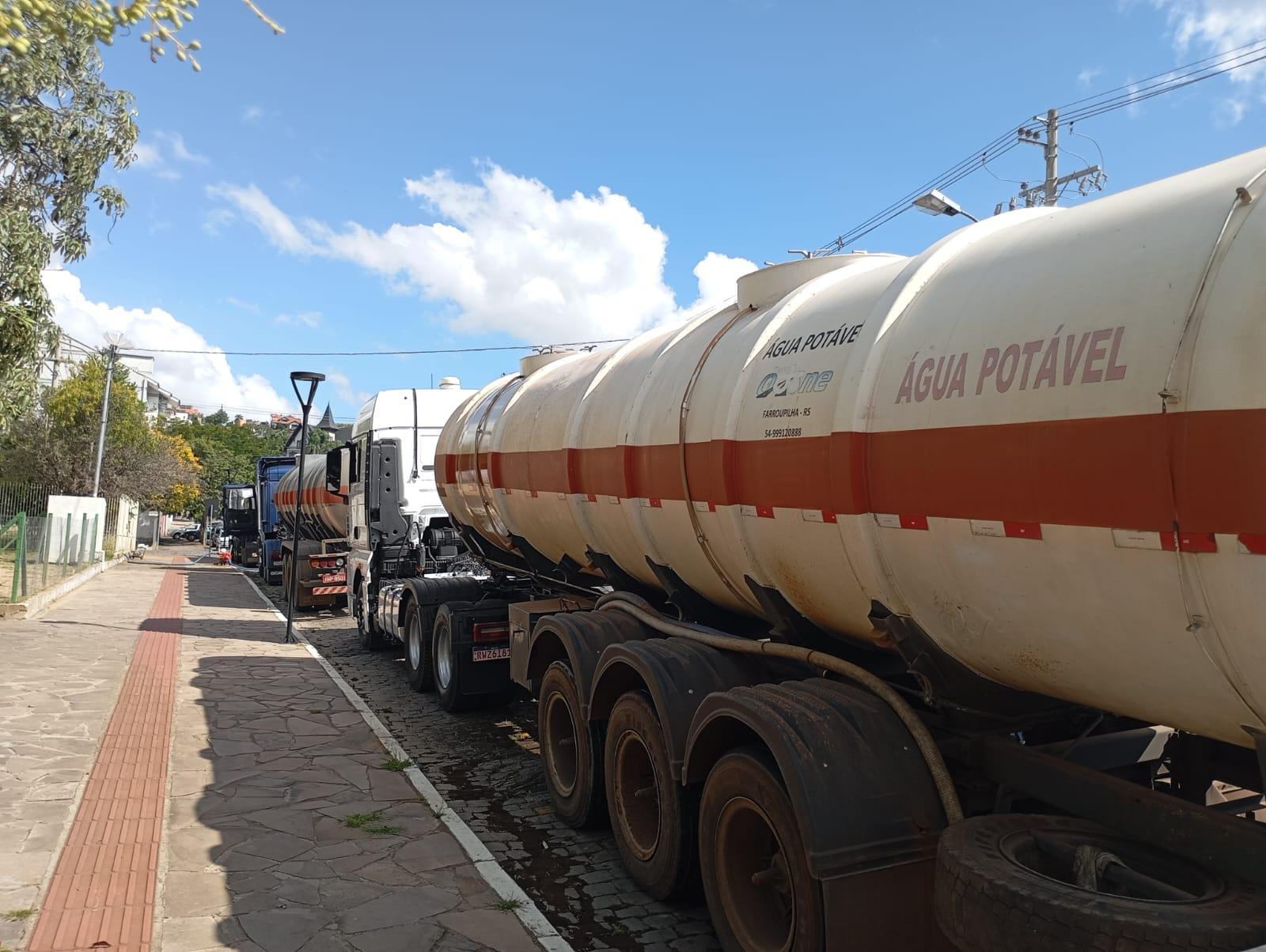 Diariamente caminhões-pipa abastecem com água na praça Nova Trento e levam a outros reservatórios de Flores da Cunha (Foto: Lucas Brito)