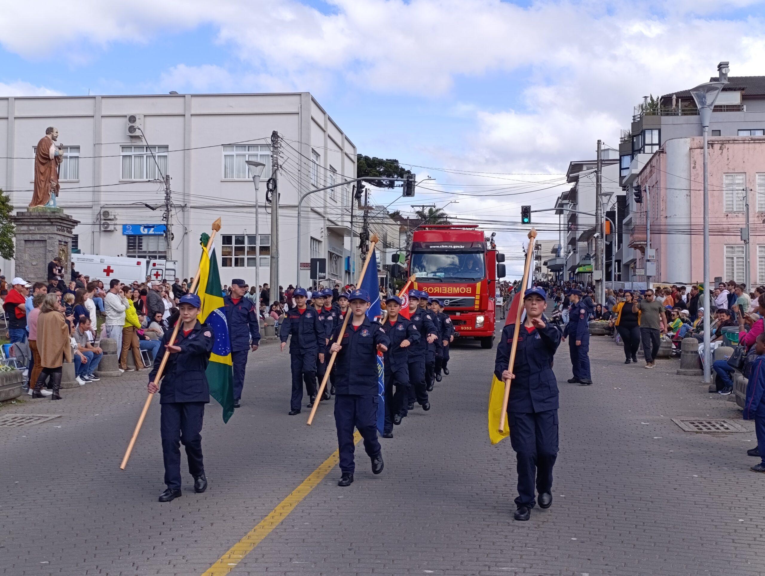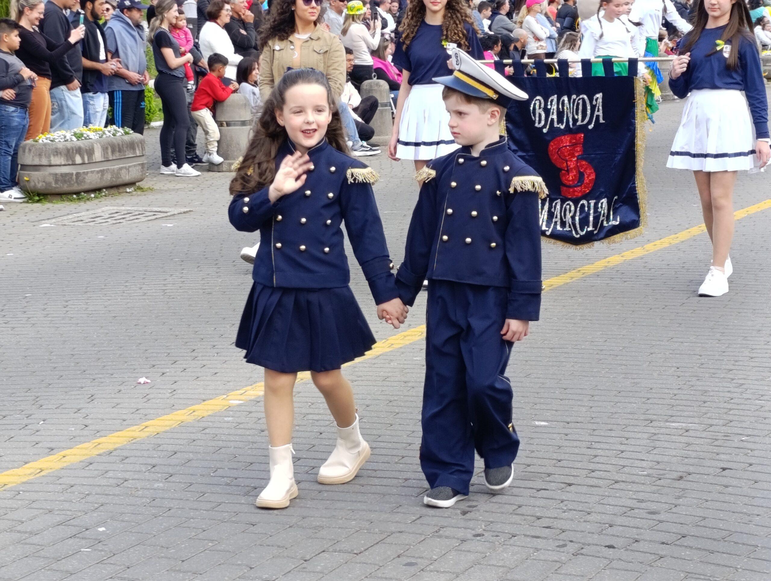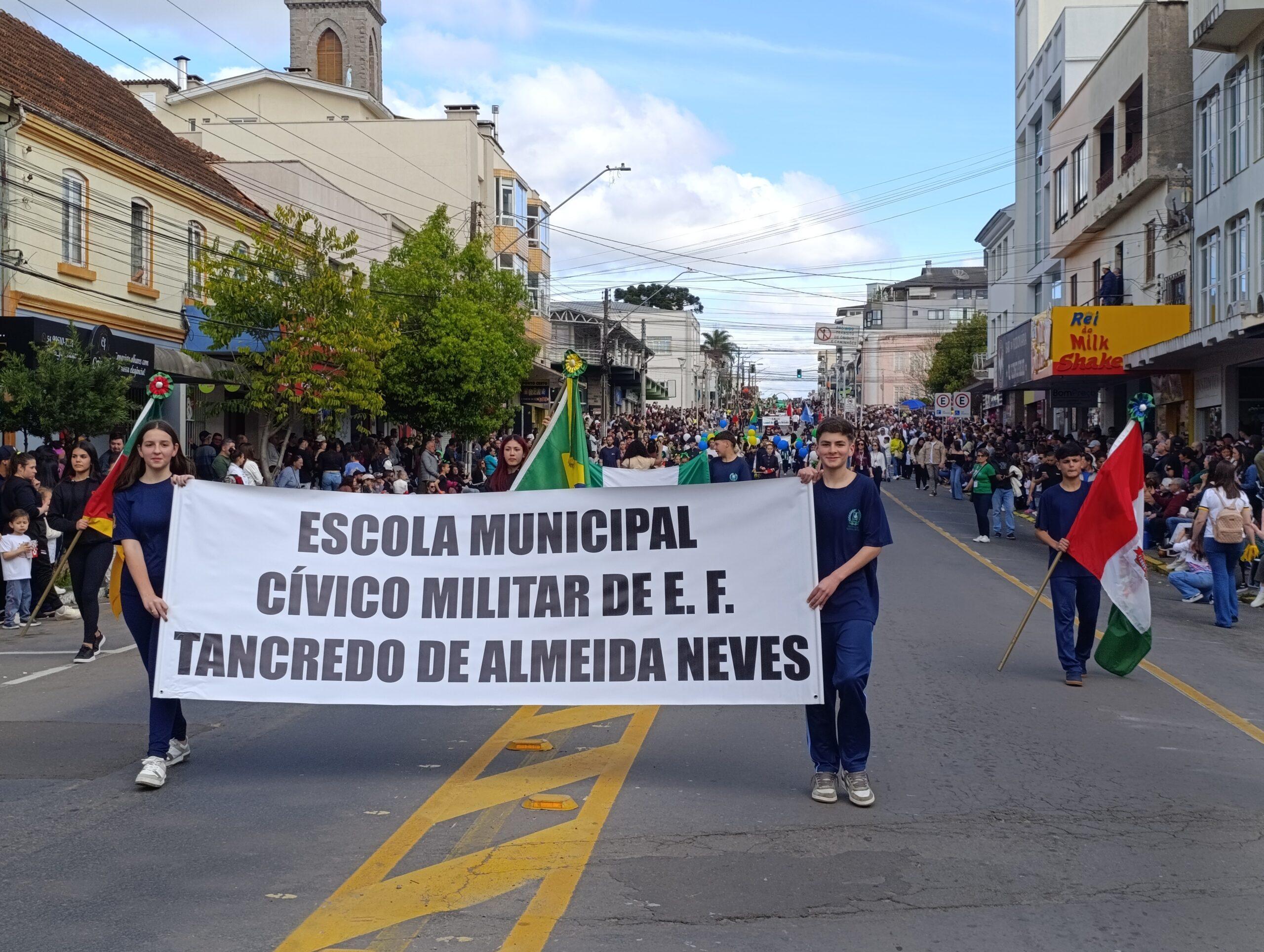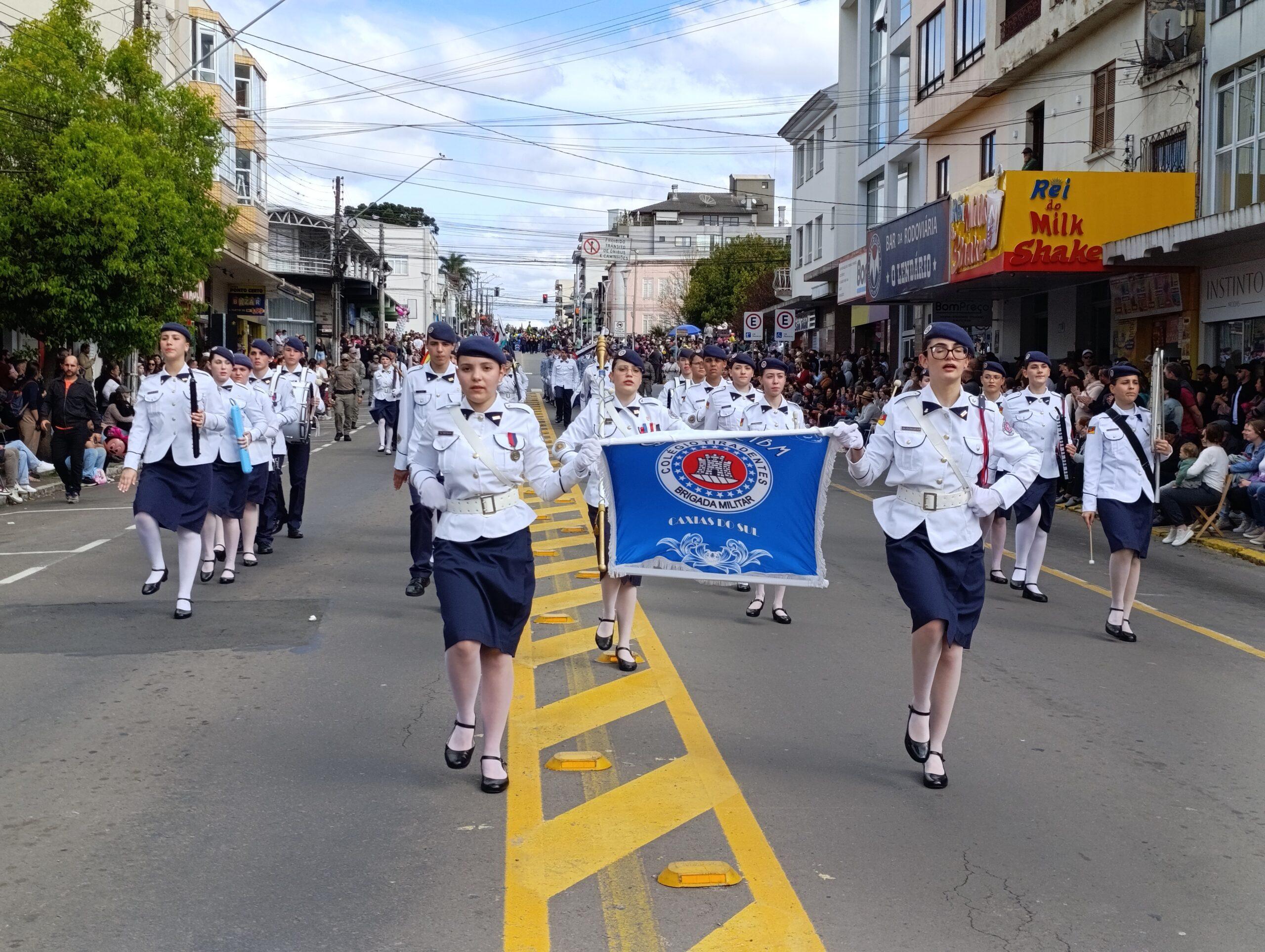 – Este é o nosso primeiro ano (desfilando em Flores da Cunha) e estamos achando bem legal o fato de a gente ser bem visto pela nossa postura, enfim. Aqui é diferente do desfile de Caxias, também pela dimensão das cidades. Mas foi uma experiência nova para nós – relatam as colegas Clara de Almeida Pascoali e Manuela Studzinski Antunes, ambas com 15 anos, estudantes do Colégio Tiradentes da Brigada Militar de Caxias do Sul.