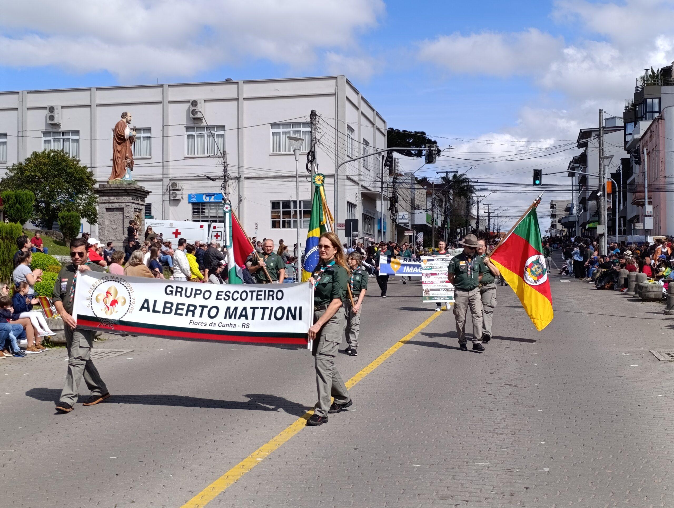 O Grupo Escoteiro Alberto Mattioni foi um dos que desfilou na tarde deste domingo. De acordo com o presidente, Dante João Sandi, 59 anos, é uma honra representar a entidade em eventos como este.