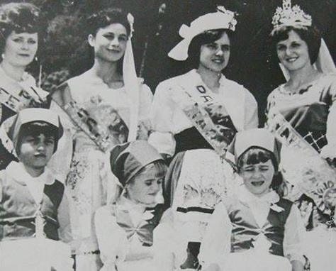 A corte da Festa Paroquial da Uva era formada por Carmem Isabel Schio, Edenir Scopel, Elizabeta Molon e a rainha Teresinha Slaviero. As pequenas “damas de companhia” eram Teresinha Molon, Rita e Rosane Caldart, filhas do casal presidente Francisco e Adélia Caldart (Foto: Acervo pessoal Ivo Maioli/ Reprodução)