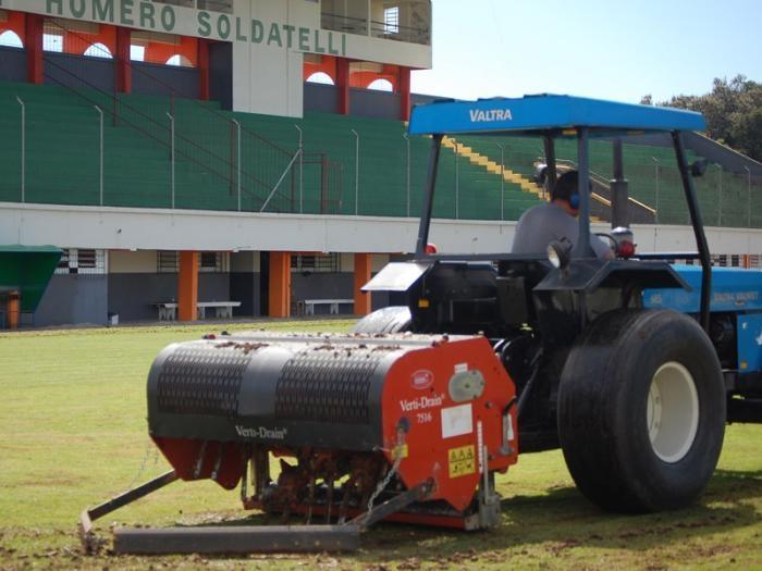 Em manutenção há uma semana, o Estádio Municipal Homero Soldatelli recebeu, nesta quarta-feira, dia 15, mais uma etapa dos trabalhos para recuperação do gramado. Uma máquina equipada com pinos ocos realizou o descompactamento do solo, melhorando o sistema de drenagem e preparando-o para adubação e nivelamento com areia. Por conta dos trabalhos, o complexo deverá ficar fechado até a primeira quinzena de outubro. A obra, incluindo a aquisição de 50 metros cúbicos de areia, além de insumos, irá custar cerca de R$ 15 mil.