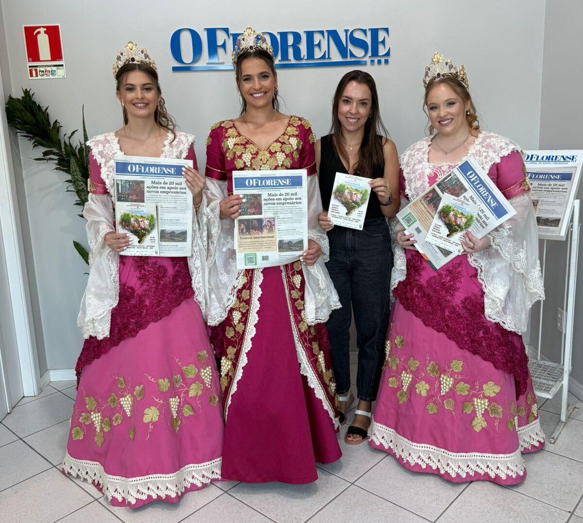 O jornal O Florense recebeu, na sexta-feira (9), a corte da La Prima Vendemmia, composta pela rainha Luana Pasuch e pelas princesas Leticia Turchetto Zatti e Juliana Magnaguagno. A visita teve como objetivo formalizar o convite à comunidade de Flores da Cunha para a retomada da tradicional La Prima Vendemmia, principal celebração de Nova Roma do Sul, que retorna ao calendário após seis anos de interrupção e será realizada entre os dias 30 de janeiro e 8 de fevereiro.