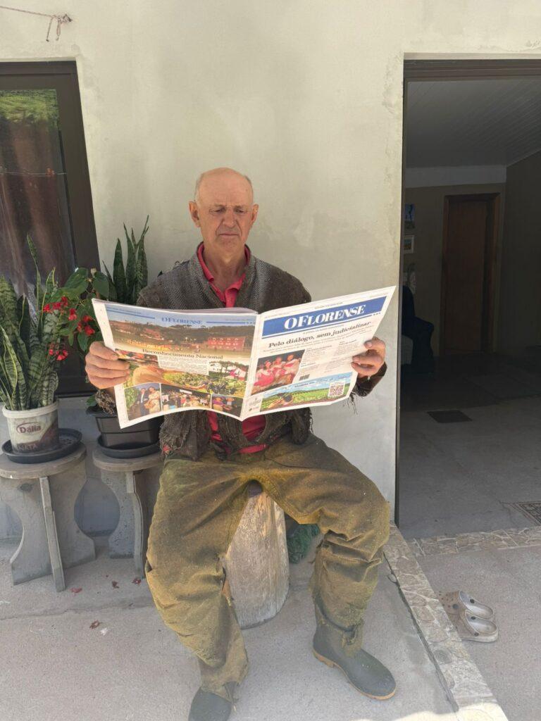 A leitura, no entanto, não se limita aos livros. No meio rural, entre as tarefas do campo e os momentos de descanso, o agricultor Vilson Cesar Guareze, 67 anos, mantém uma relação constante com a informação por meio do jornal impresso.