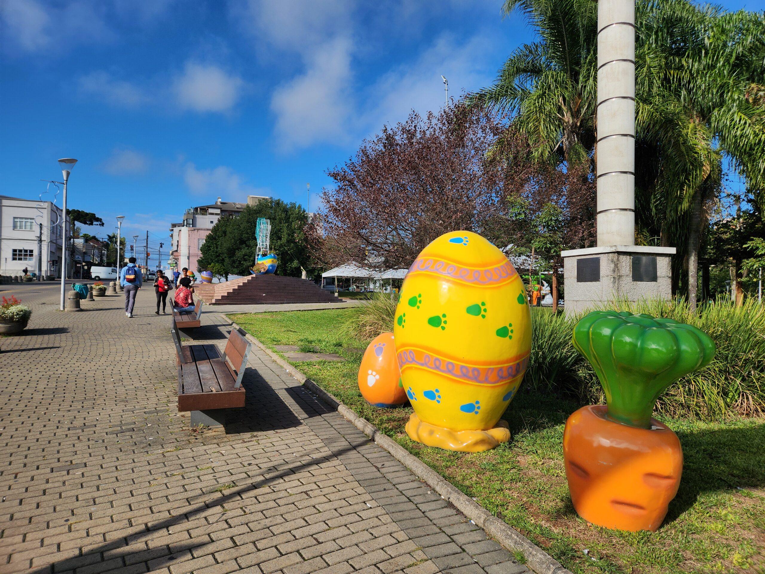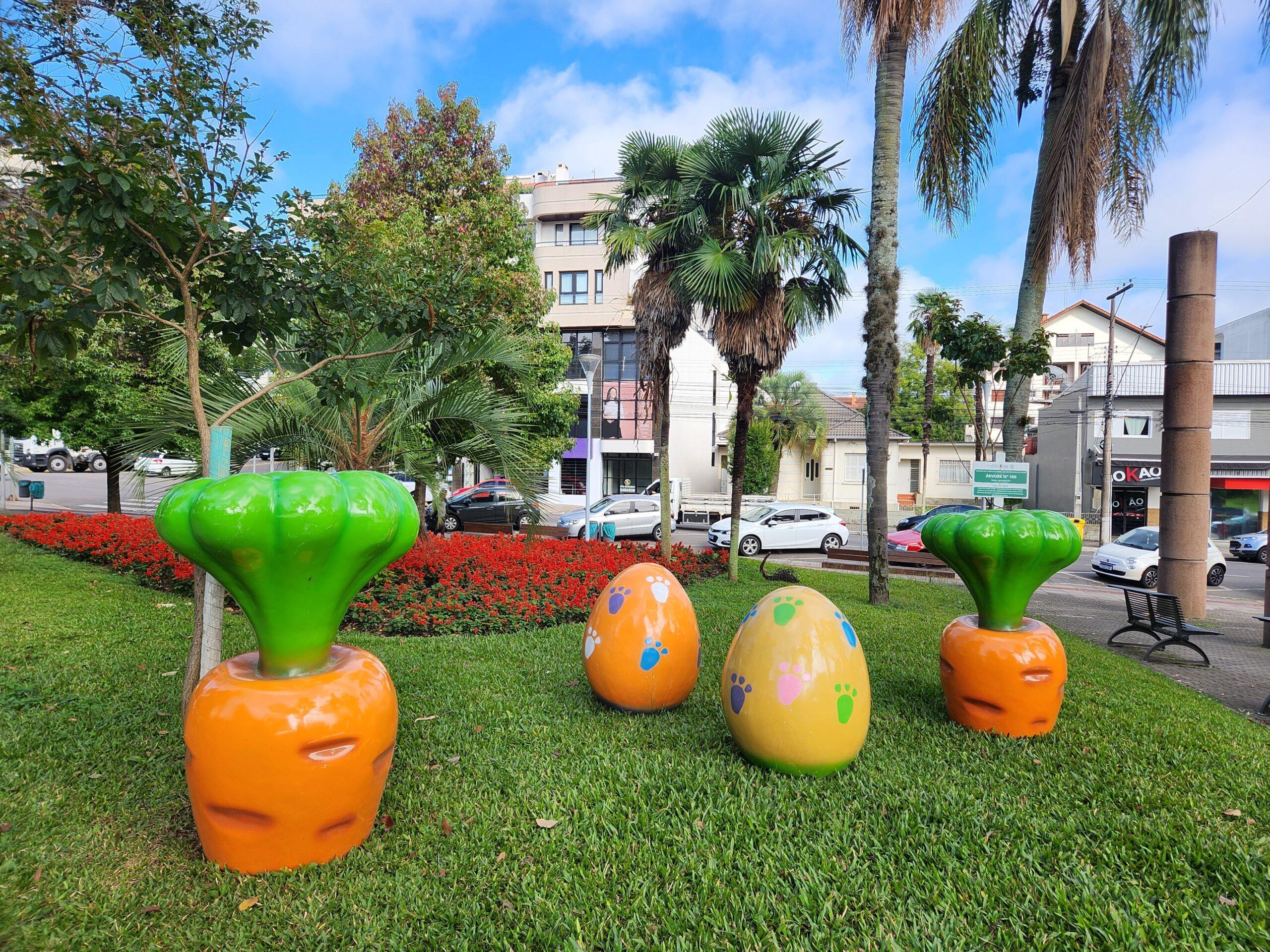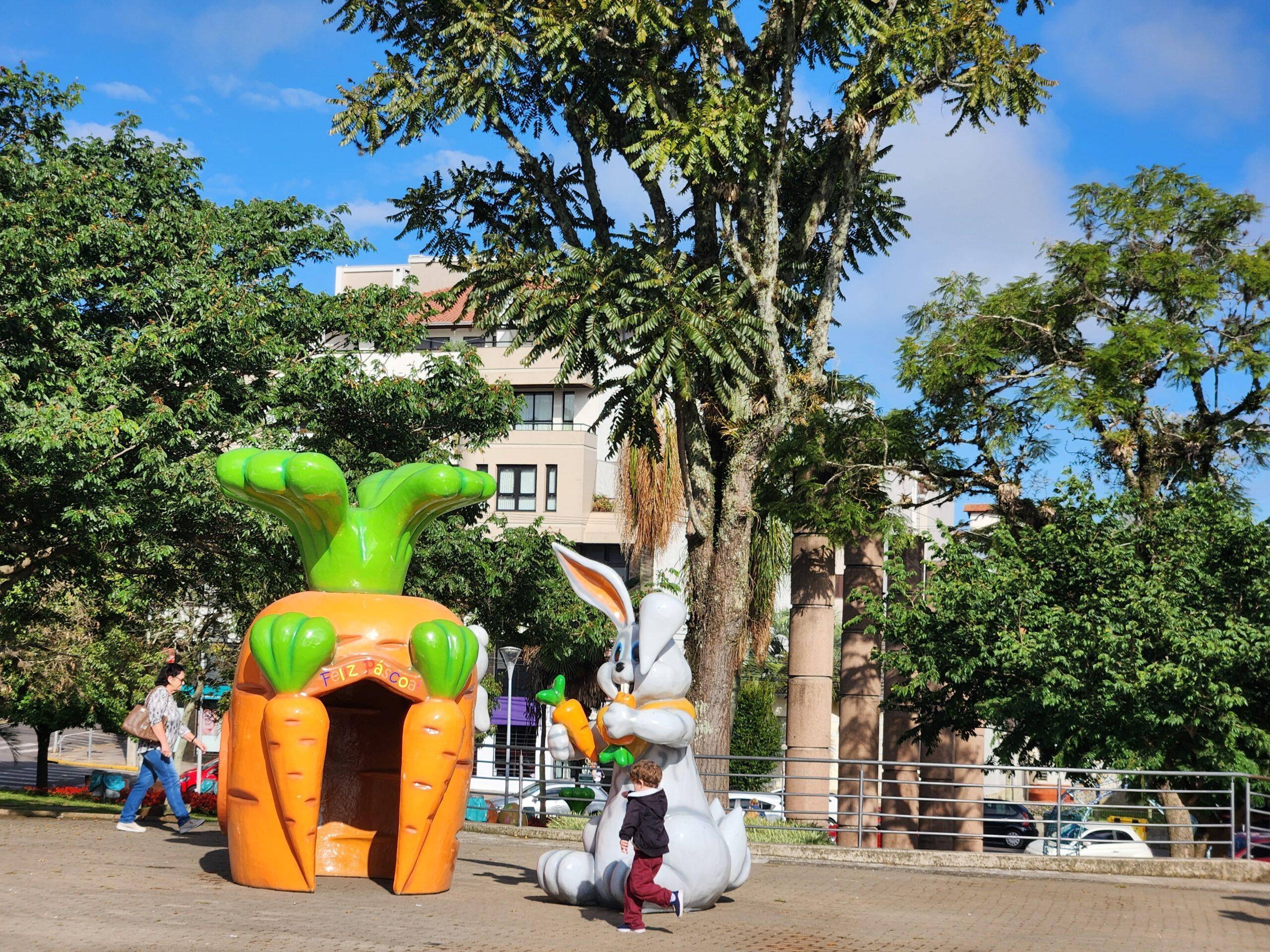 A decoração, instalada pela Prefeitura de Flores da Cunha, transformou a praça em um espaço lúdico, pensado especialmente para as famílias. Entre coelhos em tamanho gigante, ovos coloridos, cenouras que são escorregadores e painéis de LED que se iluminam à noite, o cenário vem chamando a atenção de quem passa pelo centro, e despertando a imaginação dos pequenos.