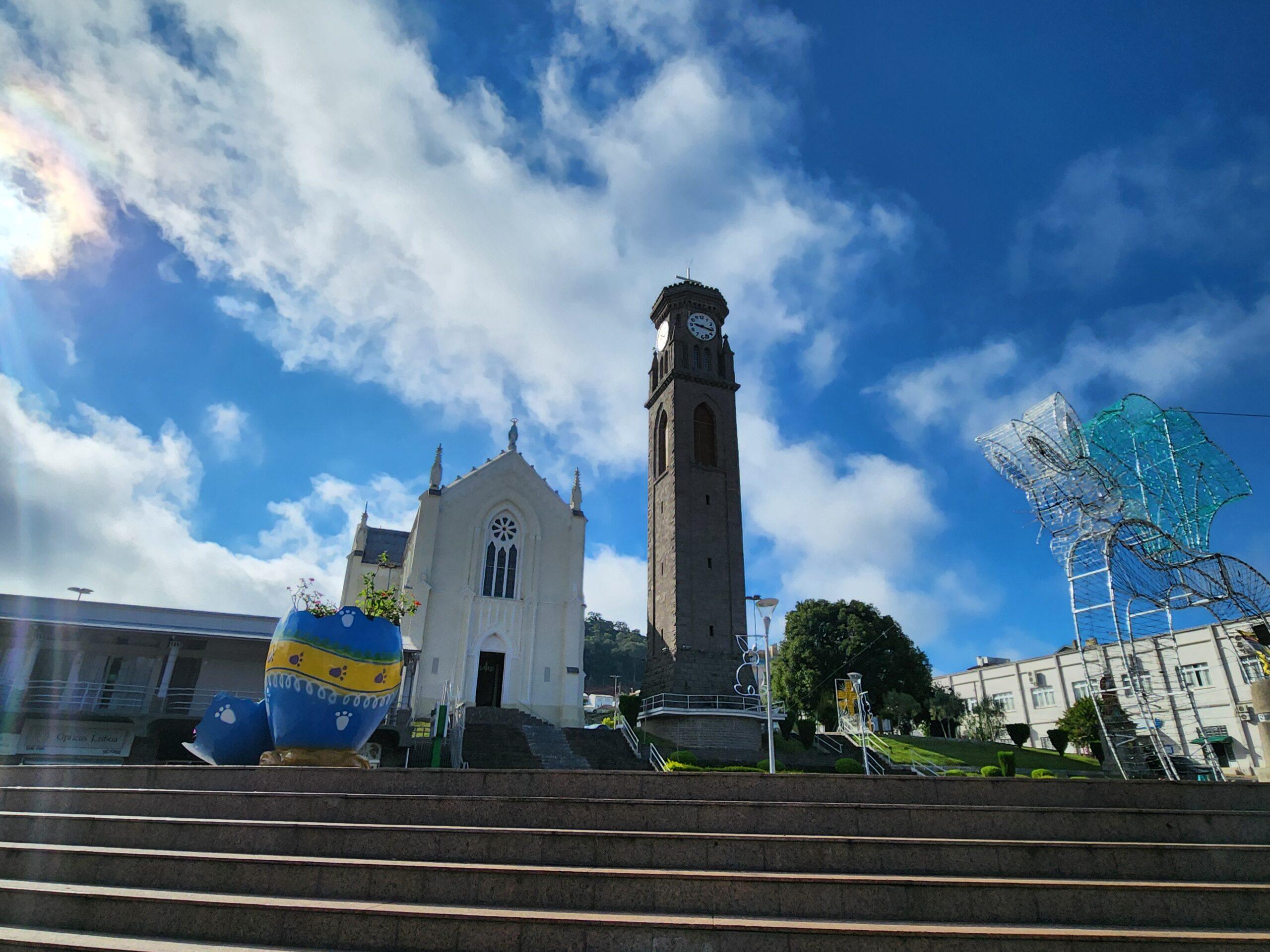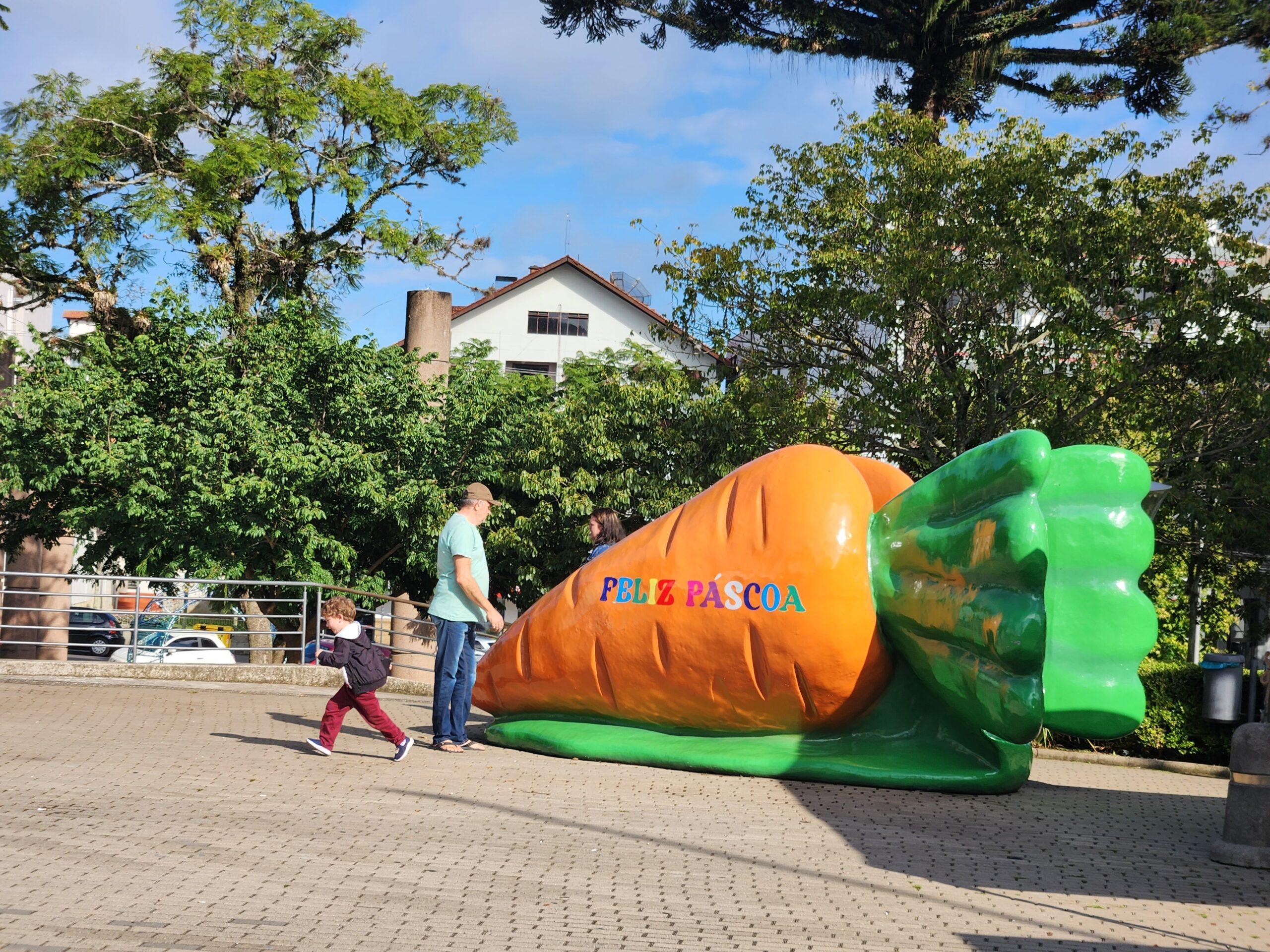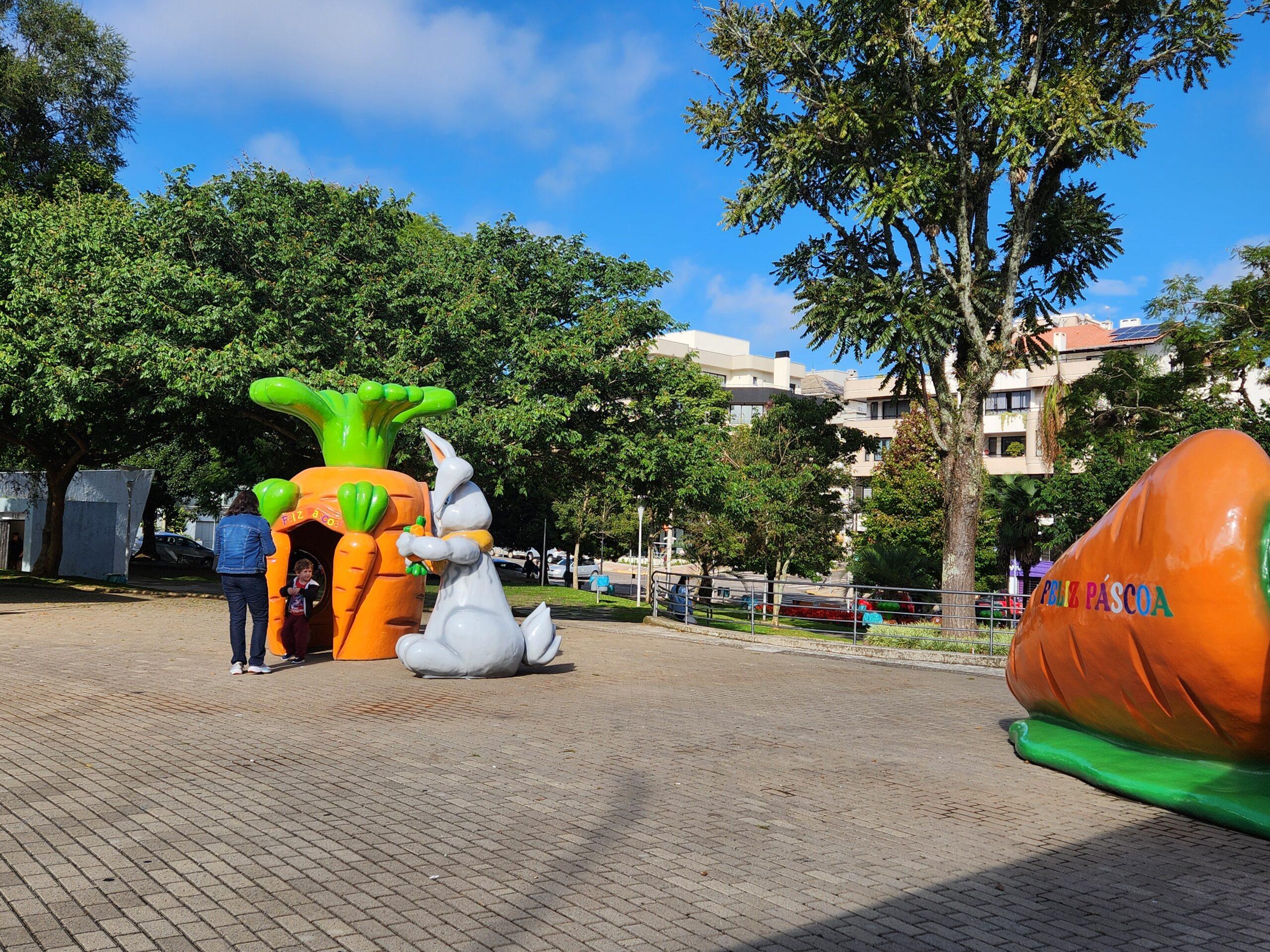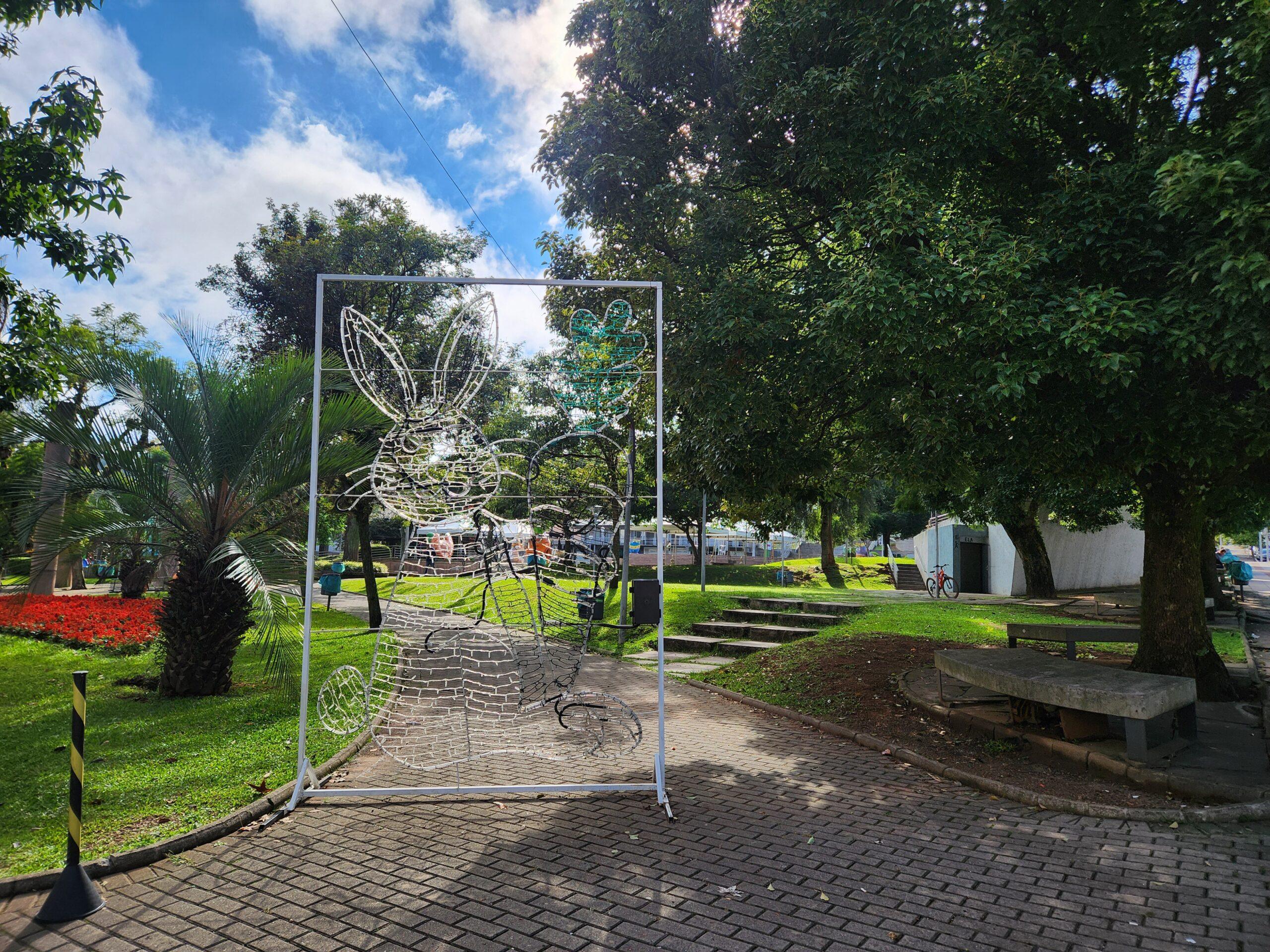 A decoração, instalada pela Prefeitura de Flores da Cunha, transformou a praça em um espaço lúdico, pensado especialmente para as famílias. Entre coelhos em tamanho gigante, ovos coloridos, cenouras que são escorregadores e painéis de LED que se iluminam à noite, o cenário vem chamando a atenção de quem passa pelo centro, e despertando a imaginação dos pequenos.