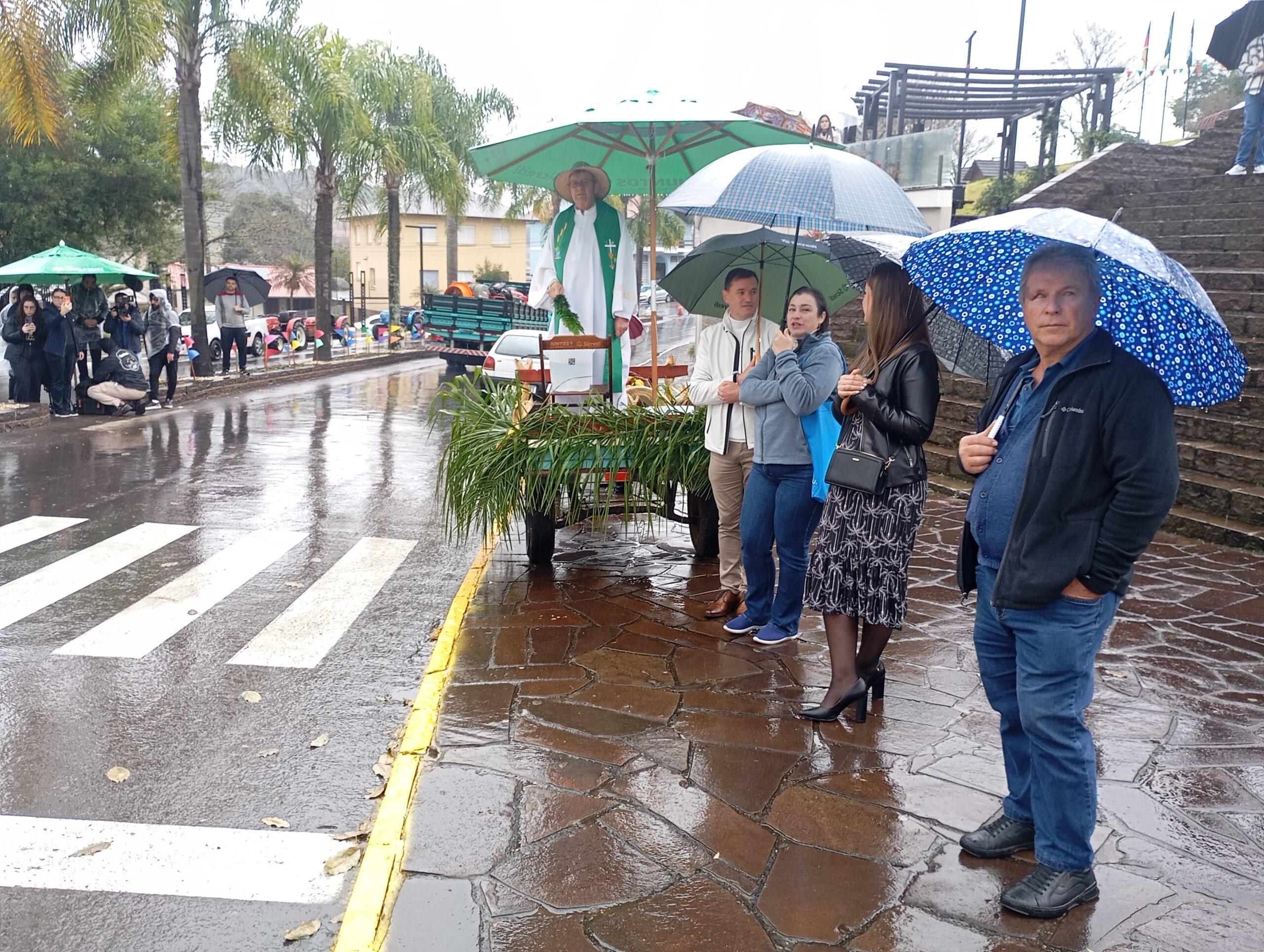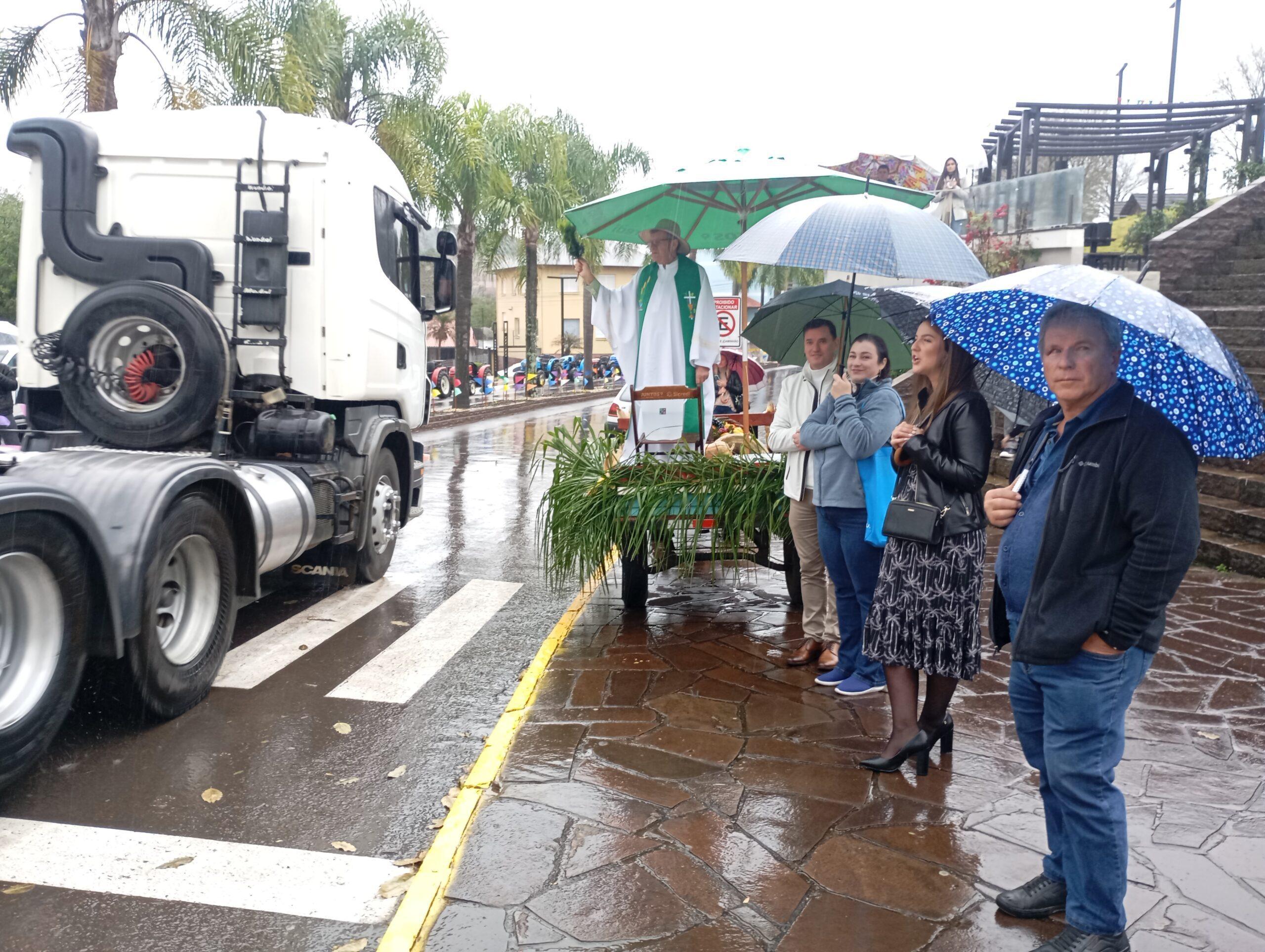 Por mais de uma hora, o padre José Mussoi, responsável pela Igreja Matriz Santo Antônio, concedeu a benção aos colonos, devotos de Isidoro, e aos profissionais que ganham a vida sobre rodas, sempre sob a proteção de São Cristóvão, o padroeiro dos caminhoneiros e de todos os demais motoristas. Ao longo da avenida central, os guarda-chuva e sombrinhas foram companhia indispensável para que todos que compuseram o desfile, fossem saudados com acenos e aplausos por quem fez questão de prestigiar o ato religioso.