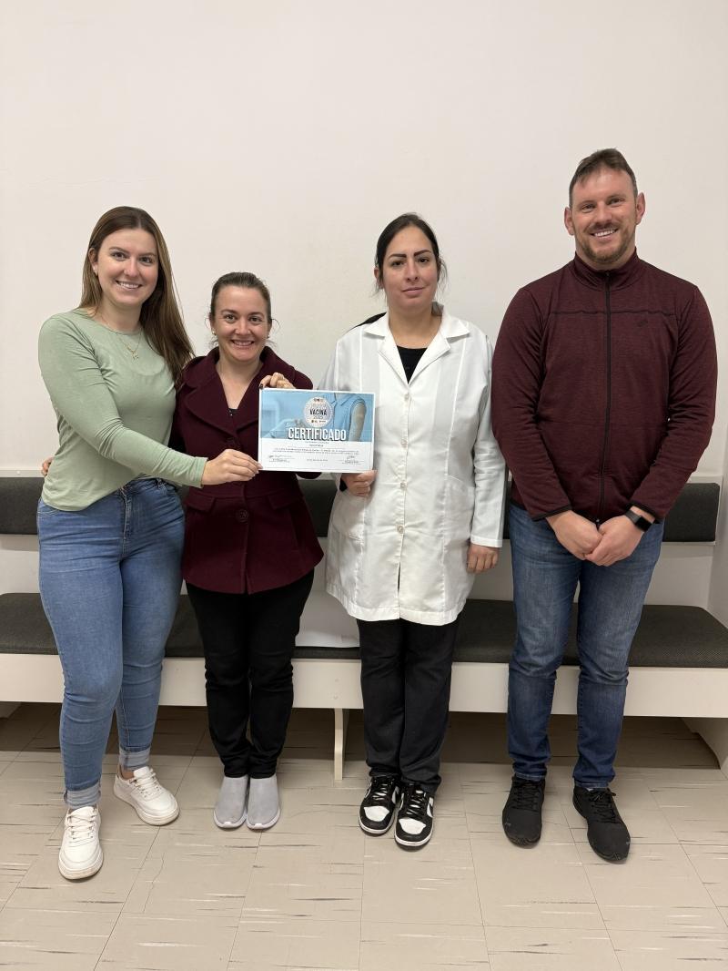A entrega do certificado autoridades locais da área da saúde. Representaram Nova Pádua a vice-prefeita Renata Zampieri, o secretário municipal da Saúde Diego Bernardi, a diretora de Saúde Pública Valquíria da Cruz e a enfermeira Sandrine Severo.