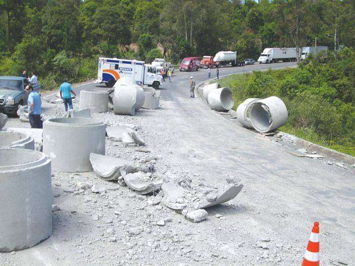 Mais um acidente foi registrado na manhã desta quarta-feira, dia 3, no km 90 da ERS-122, próximo a São Gotardo. Um caminhão carregado de tubos de concreto perdeu parte da carga, atingindo dois carros que trafegavam pela rodovia em direção a Flores da Cunha. Conforme o sargento Granzila, da Polícia Rodoviária Estadual (PRE) de Farroupilha, o caminhão Mercedes Benz, placas ITC-0682, de Caxias do Sul, com semi-reboque, conduzido por Antônio Dirceu Halbano, 52 anos, seguia sentido Flores-Caxias quando, numa curva próximo ao acesso a Safit, em São Gotardo, parte da carga se desprendeu, caindo sobre a pista. Pelo menos dois veículos, um Jetta, placas JCJ-1600, de Bento Gonçalves, conduzido por Volmir Poletto, 44 anos, e uma caminhoneta S-10 placas IKV-4530, de Flores da Cunha, dirigida por Beatriz Molon Rech, 43 anos, foram atingidos pela carga. Apenas o condutor do Jetta teve ferimentos leves.