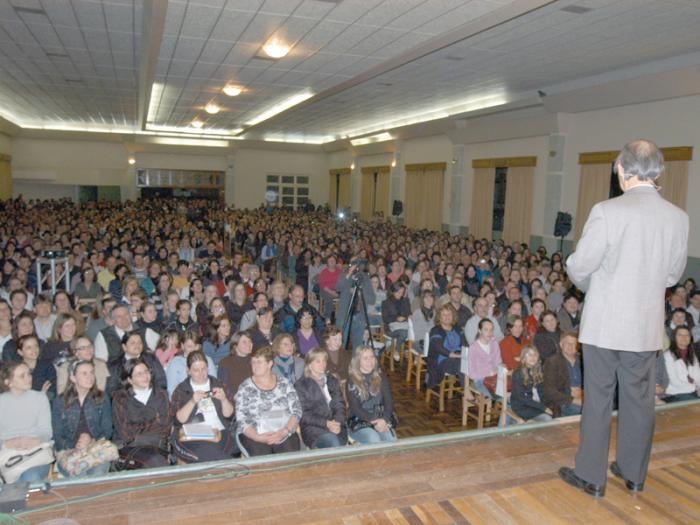 Poucos palestrantes são recebidos com o público de pé e sob aplausos. Foi o que aconteceu com o médico psiquiatra Içami Tiba na segunda-feira, dia 27, no salão paroquial. Durante uma hora e meia, ele falou para cerca de 2,3 mil pessoas durante o 2° Fórum Educacional Regional, evento já consolidado em Flores da Cunha e que teve pleno êxito, segundo a secretária de Educação Claudete Gaio Conte. Entre os temas abordados por Içami estiveram a educação, o exemplo e os limites às crianças e aos adolescentes.