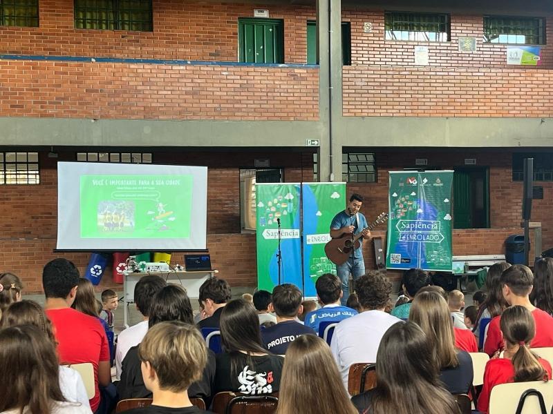As escolas Libera Bianchin Salvador e Luiz Gelain, em Nova Pádua, na última quinta-feira (10), realizaram uma atividade que uniu música, literatura e cidadania. O cantor, compositor, filósofo e escritor Rodrigo Munari conduziu uma palestra musicada para alunos da rede pública municipal e estadual, como parte do projeto de incentivo à leitura do livro Sapiência e Enrolado.
