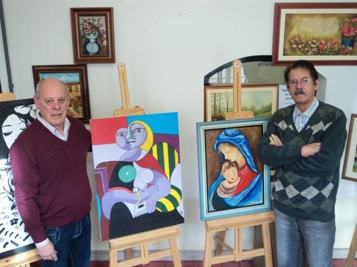 Os artistas João Batista Mambrini e Albano Rossetto com suas telas.