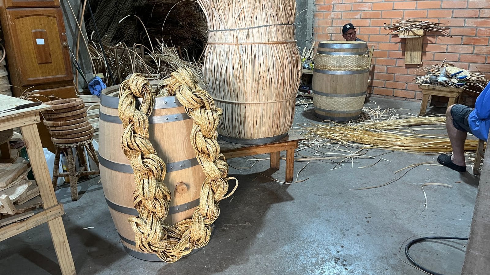 Na Terra do Galo, uma das obras é a instalação “Tramas da Tradição”, criada pelo Coletivo Artesanato de Fibra RS, com Tatiana Laschuk, Rosângela Saccaro, Manuela Rosa e Jaqueline Bissolotti. A peça reúne três barricas que simbolizam o ciclo da tradição: a matéria-prima que nasce da terra, o gesto humano que transforma e o saber transmitido entre gerações. Vime e dressa revelam diferentes etapas do processo artesanal, do cru ao elaborado, mostrando a tradição como prática viva, mantida pela repetição e pela experiência sensível. A instalação fica na Fante Bebidas, e ressalta o valor do trabalho manual, coletivo e ancestral da Serra Gaúcha.