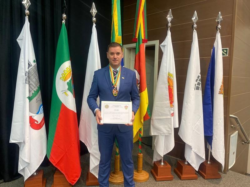 O prefeito de Nova Pádua, Itamar Bernardi, recebeu a Comenda do 36º Batalhão de Polícia Militar (BPM) na manhã da última terça-feira (19), em cerimônia realizada no auditório do Sindilojas, em Farroupilha.