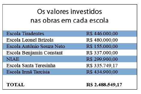 Dentre as obras atuais, duas escolas passam por uma ampla reforma. O maior montante foi para Escola Leonel de Moura Brizola, no bairro Pérola, com R$ 480 mil em melhorias.