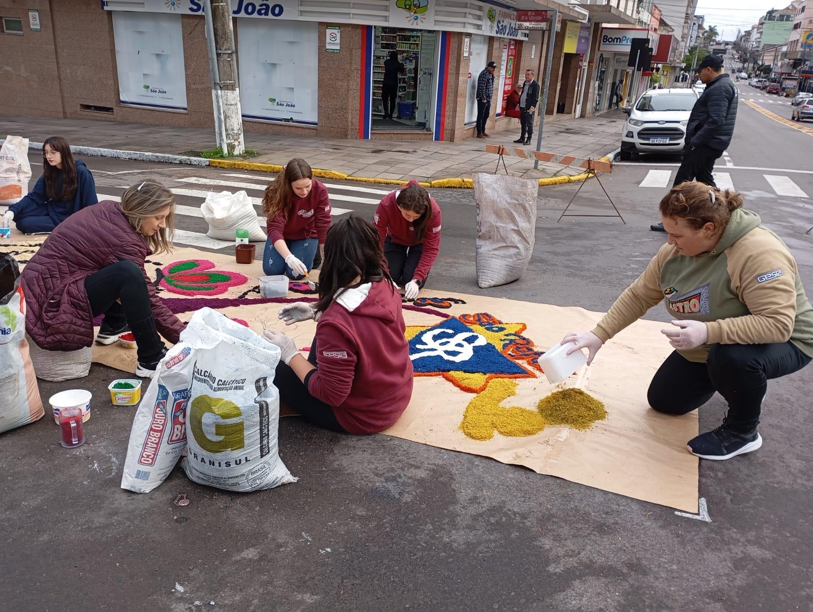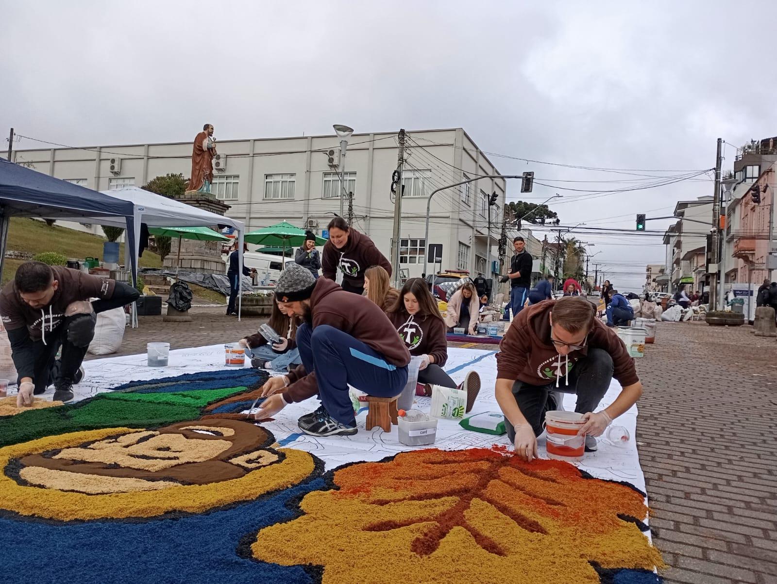 O frio e a chuva dos últimos dias não impediram a comunidade de preparar os seus tapetes de serragem colorida. O Corpus Christi em Flores da Cunha, que é referência no Rio Grande do Sul, precisou ser transferir sua programação de quinta-feira (19) para o final de semana. Apesar das dúvidas sobre o clima, os florenses corresponderam ao chamado e iniciaram os trabalhos com a serragem ao redor da Praça da Bandeira, às 7h deste sábado (21). As artes comunitárias estarão prontas para a missa e procissão do domingo (22), a partir das 9h.
