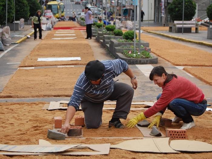 Voluntários e representantes de entidades de Flores da Cunha já trabalham na elaboração dos tapetes de Corpus Christi, festa que acontece manhã na cidade. Serão utilizadas mais de 60 sacos de serragem para a elaboração dos 976m² de tapetes.