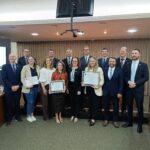 A sessão solene ocorreu na última terça-feira (14) e condecorou quatro escolas da Terra do Galo. A Escola Municipal de Ensino Fundamental São José recebeu o Diploma Mérito Educativo com o projeto “Construindo Lideranças”, a Escola Municipal de Ensino Fundamental 1° de Maio foi agraciada com a Menção Honrosa pelo trabalho “Intergeracionalidade”, a Escola Municipal de Ensino Fundamental Antônio de Souza Neto, com o projeto “+ Família – Celular”, e a Escola Interativa, com o projeto “Carreira em foco”, receberam Certificado de Participação.