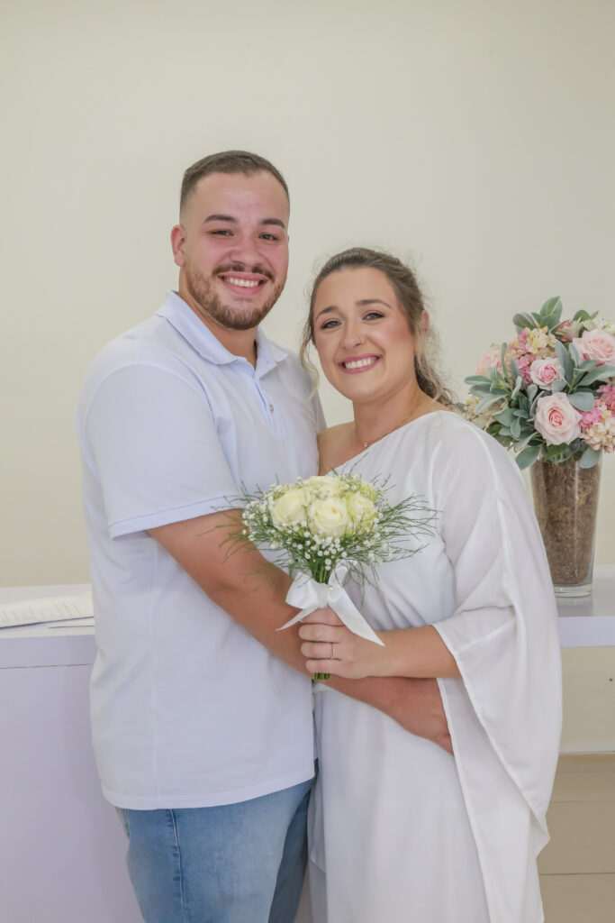 A alegria de Pablo Hugo Giaretta e Francieli Angheben na solenidade do casamento civil.