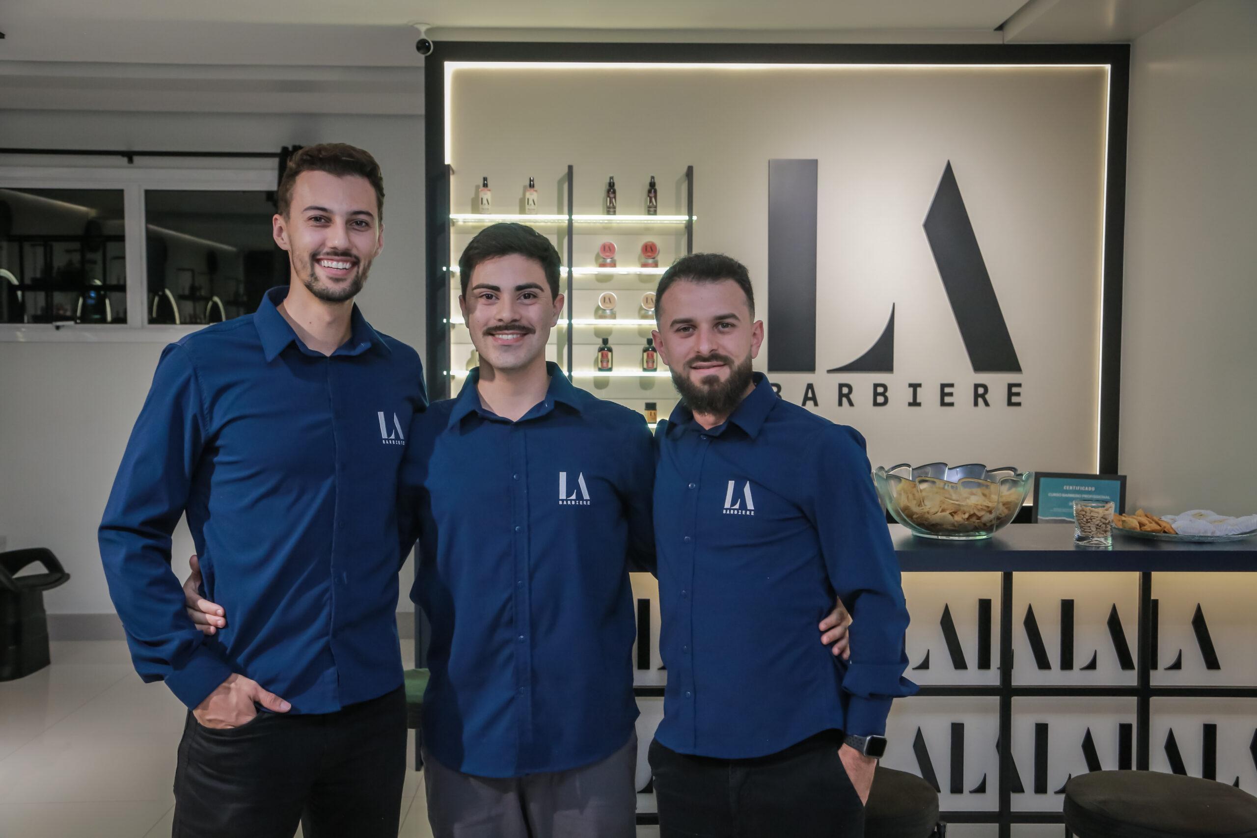 Os sócios Lucas Toigo, André Quadri e Roberto Stuani na inauguração da La Barbiere, na última quinta-feira (27).