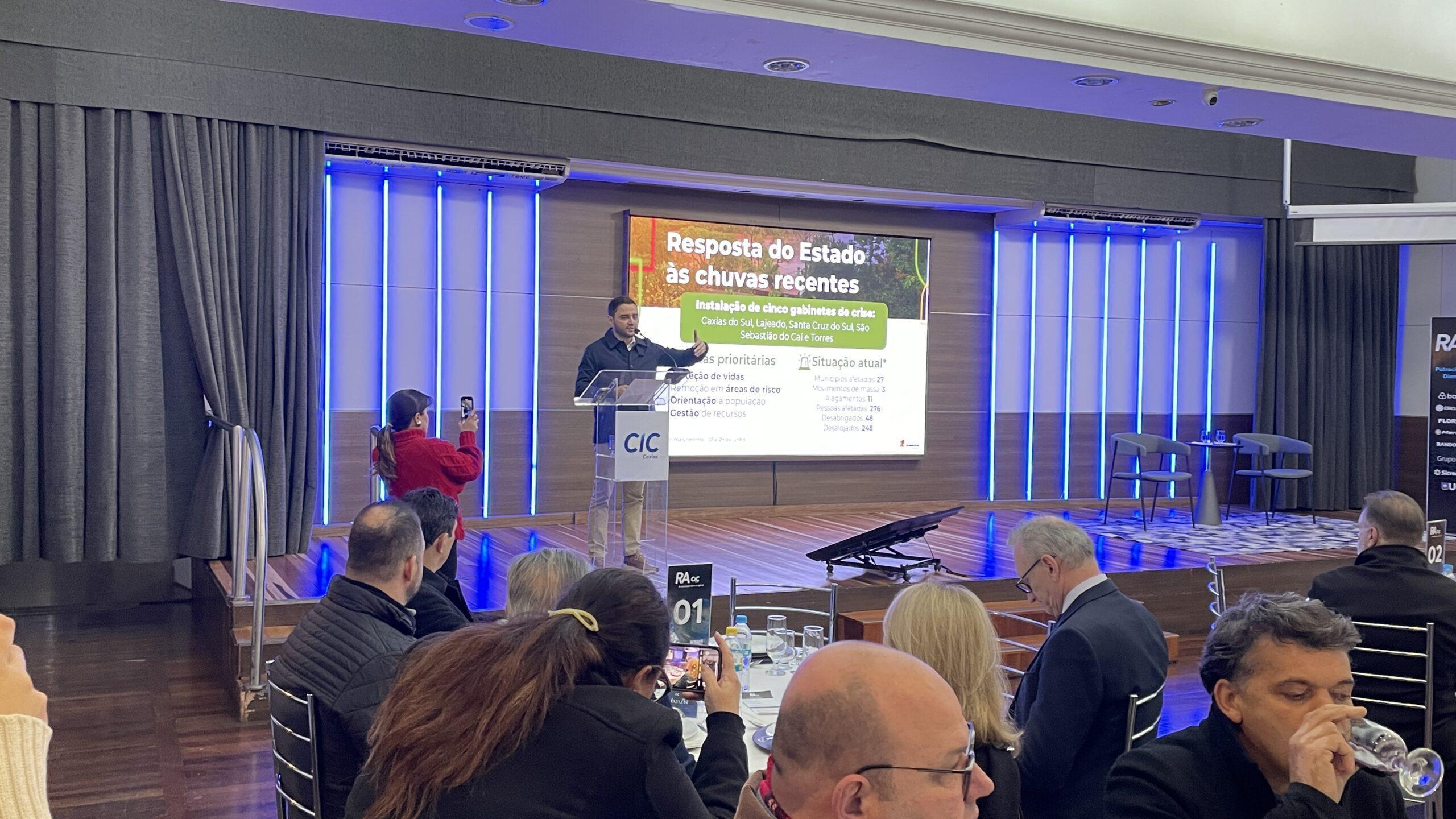 Antes da fala do vice-governador, o presidente da CIC Caxias, Celestino Oscar Loro, defendeu maior agilidade nas obras de acesso ao novo aeroporto de Vila Oliva e cobrou protagonismo do Estado em projetos estratégicos, como a BR-448, o Porto Meridional e o terminal rodoferroviário de Vacaria.