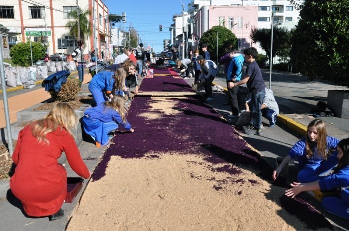 A missa campal, que deve ter a presença do bispo da Diocese de Caxias do Sul, dom Alessandro Ruffinoni, será realizada a partir das 9h30min. À tarde, às 13h30min, será realizada a caminhada do Centro até o Eremitério do Frei Salvador, com missa agendada para as 14h30min. Confira abaixo fotos e vídeos da confecção dos tapetes pela comunidade.